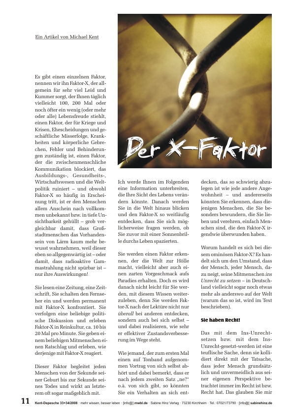 »Es gibt einen einzelnen Faktor, nennen wir ihn Faktor-X, der allgemein für sehr viel Leid und Kummer sorgt, der Ihnen täglich vielleicht 100, 200 Mal oder noch öfter ein wenig (oder mehr oder alle) Lebensfreude stiehlt, einen Faktor, der für Kriege und Krisen, Ehescheidungen und geschäftliche Misserfolge, Krankheiten und körperliche Gebrechen, Fehler und Behinderungen zuständig ist, einen Faktor, der die zwischenmenschliche Kommunikation blockiert, das Ausbildungs-, Gesundheits-, Wirtschaftswesen und die Weltpolitik ruiniert – und obwohl Faktor-X so häufig in Erscheinung tritt, ist er den Menschen allem Anschein nach vollkommen unbekannt bzw. in tiefe Unsichtbarkeit gehüllt – grob vergleichbar damit, dass Großstadtmenschen das Vorhandensein von Lärm kaum mehr bewusst wahrnehmen, weil dieser eben so allgegenwärtig ist – oder damit, dass radioaktive Gammastrahlung nicht spürbar ist – nur ihre Auswirkungen! Sie lesen eine Zeitung, eine Zeitschrift, Sie schalten den Fernseher ein und werden permanent mit Faktor-X konfrontiert. Sie verfolgen eine beliebige politische Diskussion und erleben Faktor-X in Reinkultur, ca. 10 bis 20 Mal pro Minute. Sie geben einem beliebigen Mitmenschen einen Ratschlag und erleben, wie derjenige mit Faktor-X reagiert. Dieser Faktor begleitet jeden Menschen von der Sekunde seiner Geburt bis zur Sekunde seines Todes und wirkt an letzterem oft sogar maßgeblich mit. Ich werde Ihnen im Folgenden eine Information unterbreiten, die Ihre Sicht des Lebens verändern könnte. Danach werden Sie in die Welt hinaus blicken und den Faktor-X so weitläufig entdecken, dass Sie sich möglicherweise fragen werden, ob Sie zuvor mit einer Sonnenbrille durchs Leben spazierten. Sie werden einen Faktor erkennen, der die Welt zur Hölle macht, vielleicht aber auch einen zarten Vorgeschmack aufs Paradies erhalten. Doch es wird danach nicht leicht für Sie werden, mit diesem Wissen weiterzuleben, denn Sie werden Faktor-X nach der Lektüre nicht nur überall bei anderen entdecken, sondern auch bei sich selbst – und dabei realisieren, wie sehr er effektiver Zustandsverbesserung im Wege steht. Wie jemand, der zum ersten Mal einen auf Tonband aufgenommen Vortrag von sich selbst abhört und dabei bemerkt, dass er nach jedem zweiten Satz „ne?“ o.ä. von sich gibt, so könnten Sie ein Verhalten an sich entdecken, das so schwierig abzulegen ist wie jede andere Angewohnheit – und andererseits könnten Sie erkennen, dass diejenigen Menschen, die Sie besonders bewundern, die Sie lieben und verehren, einfach Menschen sind, die den Faktor-X irgendwie überwunden haben. Worum handelt es sich bei diesem ominösen Faktor-X? Es handelt sich um den Umstand, dass der Mensch, jeder Mensch, dazu neigt, seine Mitmenschen ins Unrecht zu setzen – in Deutschland vielleicht sogar noch etwas mehr als anderswo auf der Welt (warum das so ist, wird im Text beschrieben).«