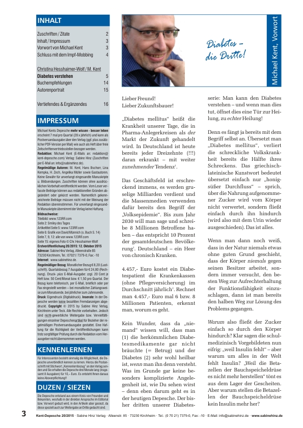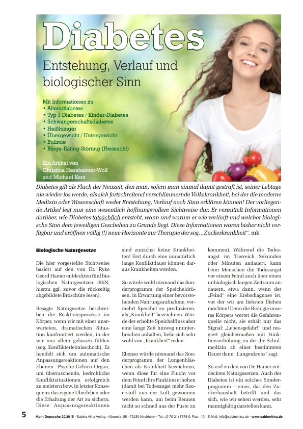 »Diabetes gilt als Fluch der Neuzeit, den man, sofern man einmal damit gestraft ist, seiner Lebtage nie wieder los wird, und bei dem die moderne Medizin oder Wissenschaft weder Entstehung, Verlauf noch Sinn erklären können! Der vorliegende Artikel legt nun eine wesentlich hoffnungsvollere Sichtweise dar. Er vermittelt Informationen darüber, wie Diabetes tatsächlich entsteht, wann und warum er wie verläuft und welcher biologische Sinn dem jeweiligen Geschehen zu Grunde liegt. Diese Informationen waren bisher nicht verfügbar und eröffnen völlig (!) neue Horizonte zur Therapie der sog. „Zuckerkrankheit“.«