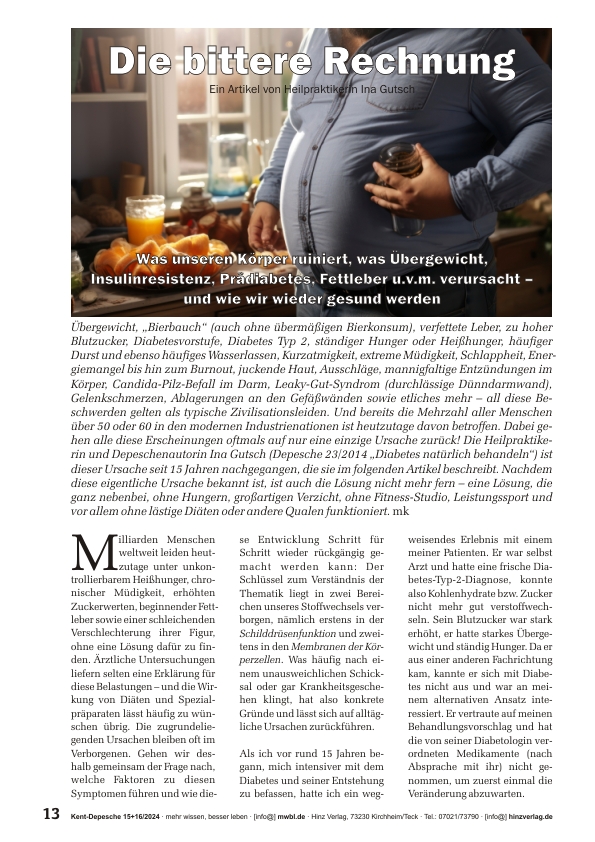 »Übergewicht, „Bierbauch“, schlechte Leberwerte, zu hoher Blutzucker, Diabetesvorstufe, ständiger Hunger, Kurzatmigkeit, Müdigkeit, Energiemangel, juckende Haut, Entzündungen im Körper, Candida-Pilz-Befall im Darm, durchlässige Dünndarmwand, Gelenkschmerzen, Ablagerungen an den Gefäßwänden ... Die Mehrzahl aller Menschen über 60 sind hierzulande von diesen „typischen Zivilisationsleiden“ betroffen. Dabei gehen diese Erscheinungen oftmals auf nur eine Ursache zurück! Die Heilpraktikerin Ina Gutsch (Autorin von „Diabetes natürlich behandeln“) ist dieser Ursache seit 15 Jahren nachgegangen, die sie im folgenden Artikel beschreibt. Nachdem diese Ursache bekannt ist, ist auch die Lösung nicht mehr fern – eine Lösung, die ohne Hungern, großartigen Verzicht, ohne Fitness-Studio, Leistungssport und ohne lästige Diäten oder andere Qualen funktioniert.«
