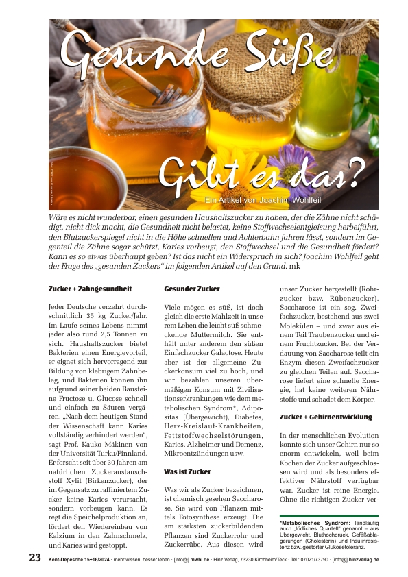 »Wäre es nicht wunderbar, einen gesunden Haushaltszucker zu haben, der die Zähne nicht schädigt, nicht dick macht, die Gesundheit nicht belastet, keine Stoffwechselentgleisung herbeiführt, den Blutzuckerspiegel nicht in die Höhe schnellen und Achterbahn fahren lässt, sondern im Gegenteil die Zähne sogar schützt, Karies vorbeugt, den Stoffwechsel und die Gesundheit fördert? Kann es so etwas überhaupt geben? Ist das nicht ein Widerspruch in sich? Joachim Wohlfeil geht der Frage des gesunden Zuckers auf den Grund.«