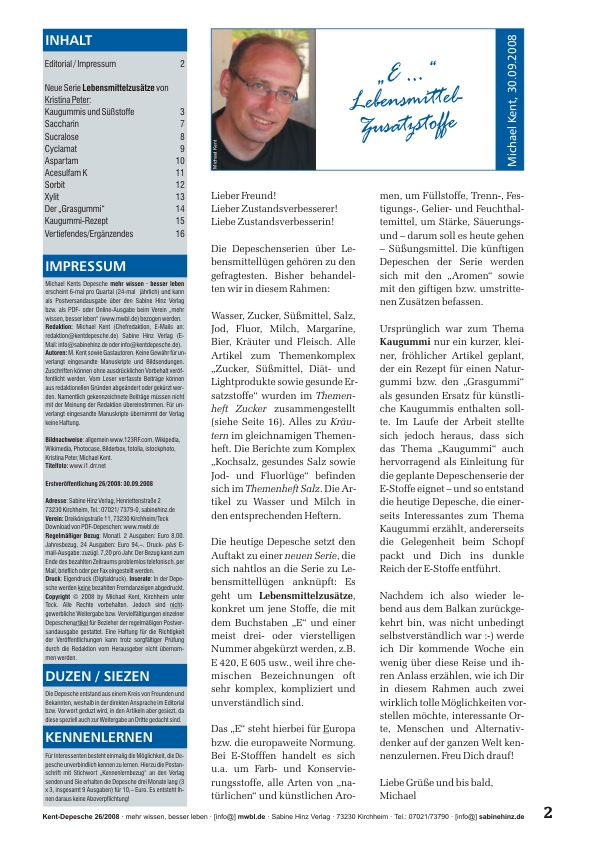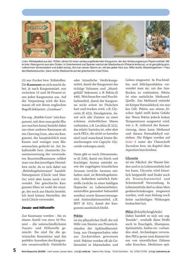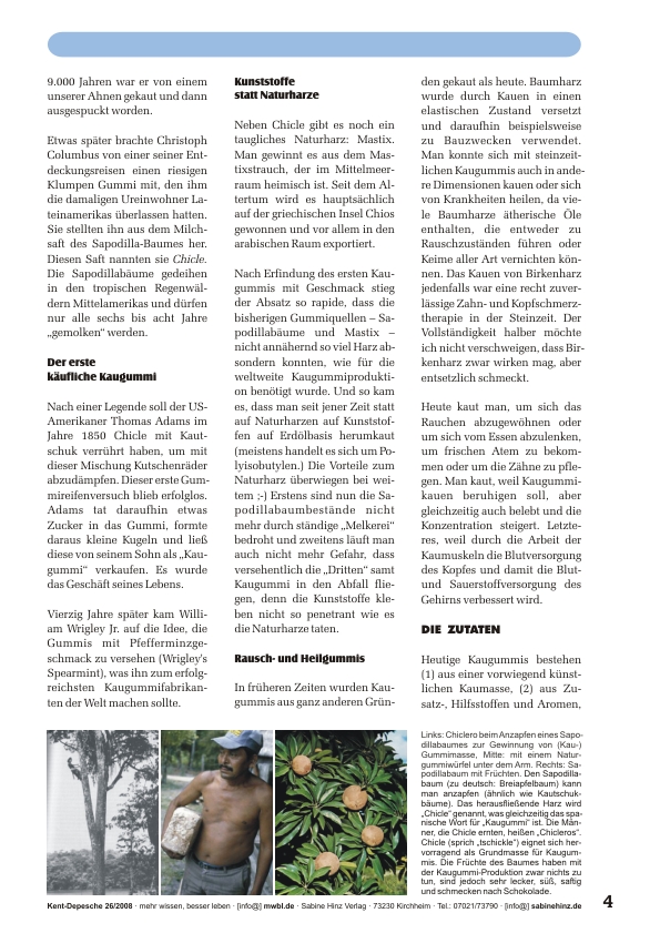 »Kaugummis waren früher einmal reine Naturprodukte. Moderne Kaugummis hingegen sind eine kunterbunte Mischung unterschiedlicher Kunst-, Farb- und Süßstoffe. Letztere sind heftig umstritten und trotzdem in vielen Ländern als Lebensmittelzusatzstoffe unbeschränkt zugelassen. Zwar bedeuten sie für die Zähne kaum Gefahr, dafür irritieren sie den Rest des Körpers. Dessen ungeachtet ist sich die Fachwelt einig: Kaugummikauen ist gesund. Welcher Kaugummi wirklich gesund ist, verrät Ihnen Kristina Peter.« mk