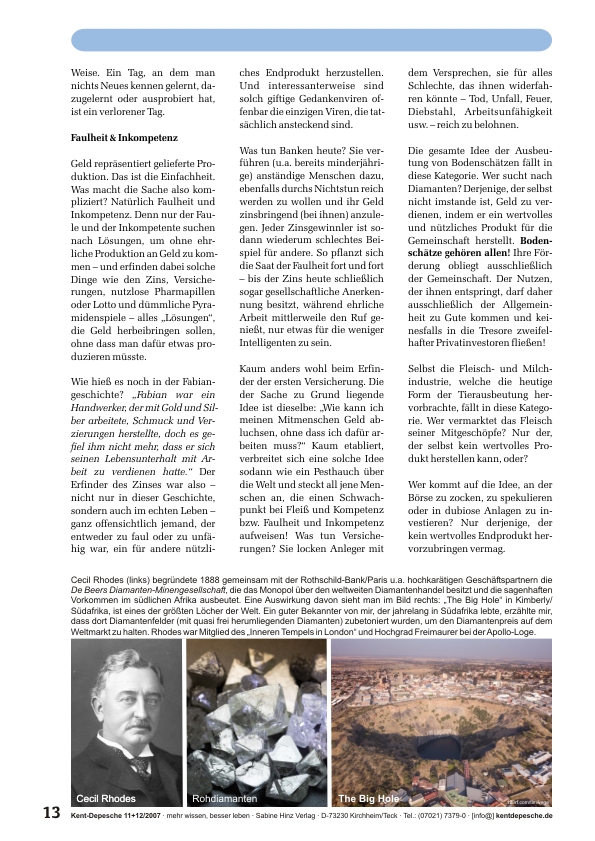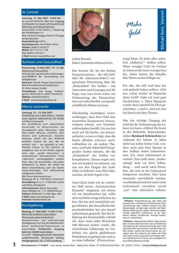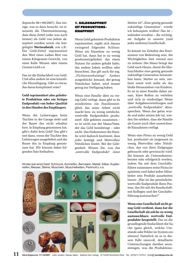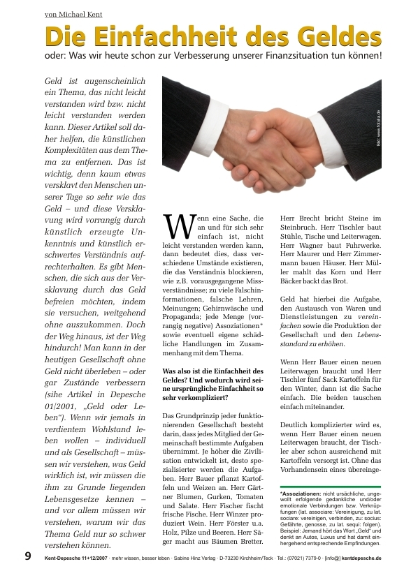 »Geld ist augenscheinlich ein Thema, das nicht leicht verstanden wird bzw. nicht leicht verstanden werden kann. Diese Depesche soll helfen, die Komplexitäten aus dem Thema zu entfernen. Das ist wichtig, denn kaum etwas versklavt den Menschen unserer Tage so sehr wie das Geld. Es gibt Menschen, die sich aus der Versklavung durch das Geld befreien möchten, indem sie versuchen, weitgehend ohne auszukommen. Doch man kann in der heutigen Gesellschaft ohne Geld nicht überleben – oder gar Zustände verbessern. Wenn wir jemals in verdientem Wohlstand leben wollen – individuell und als Gesellschaft – müssen wir verstehen, was Geld wirklich ist, wir müssen die ihm zu Grunde liegenden Lebensgesetze kennen – und vor allem müssen wir verstehen, warum wir das Thema Geld nur so schwer verstehen können.«