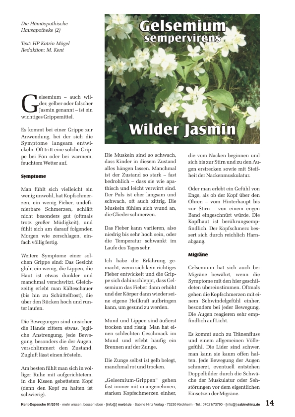 »Gelsemium – auch wilder, gelber oder falscher Jasmin genannt – ist ein wichtiges Grippemittel. Es kommt bei einer Grippe zur Anwendung, bei der sich die Symptome langsam entwickeln. Oft tritt eine solche Grippe bei Fön oder bei warmem, feuchtem Wetter auf.«