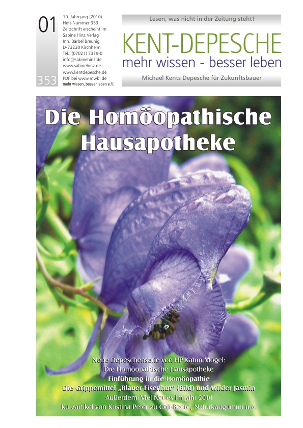 »Mit dieser neuen Depeschenserie möchte ich Ihnen das Grundlagenwissen im Umgang mit einer Homöopathischen Hausapotheke vermitteln, mit dem Sie in der Lage sein werden, sich und Ihre Familie bei akuten Krankheiten und Verletzungen selbst zu helfen sowie auch Erkrankungen vorzubeugen. Mein Name ist Katrin Mögel, ich bin Heilpraktikerin für naturheilkundliche Therapien sowie klassische Homöopathin und leite seit 2003 Homöopathiekurse für Laien. Dabei bin ich immer wieder erstaunt, wie schnell die Teilnehmer die Homöopathie akzeptieren und anwenden. Wenn einmal kein Arzt oder Heilpraktiker erreichbar ist, kann eine Homöopathische Hausapotheke ein Segen sein. In der Größe einer Federtasche kann man sie überallhin mitnehmen. Natürlich sollte jeder Anwender sein eigenes Handwerkszeug, in diesem Fall also die homöopathischen Arzneimittel, kennen. Diese werde ich im Rahmen der Serie nacheinander vorstellen. Doch zuerst seien einleitend kurz die Grundzüge der Homöopathie an sich beschrieben…«