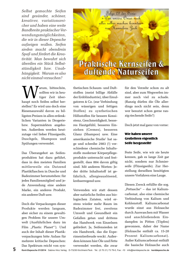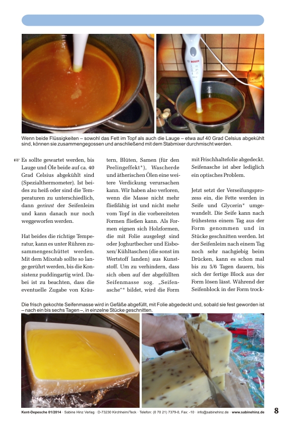»Selbst gemachte Seifen sind gesünder, schöner, kreativer, variationsreicher und haben eine weite Bandbreite praktischer Verwendungsmöglichkeiten. Seifen sieden macht obendrein Spaß und fördert die Kreativität. Man bewahrt sich überdies ein Stück Selbstständigkeit bzw. Unabhängigkeit. Warum es also nicht einmal versuchen?«