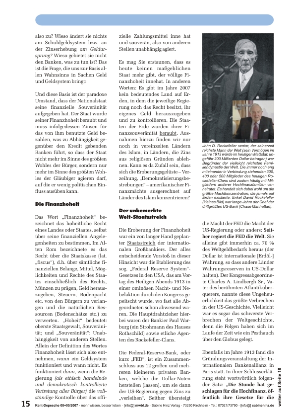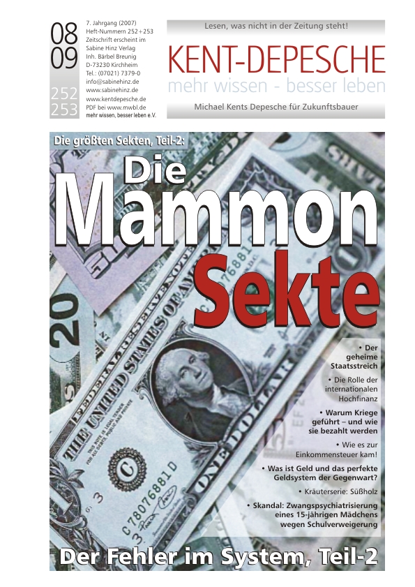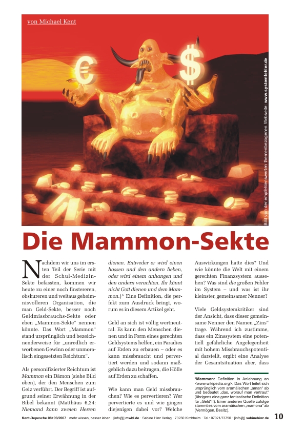 »Nachdem wir uns im ersten Teil der Serie mit der Schul-Medizin-Sekte befassten, kommen wir heute zu einer noch finstereren, obskureren und weitaus geheimnisvolleren Organisation, die man Geld-Sekte, besser noch Geldmissbrauchs-Sekte oder eben „Mammon-Sekte“ nennen könnte. Das Wort „Mammon“ stand ursprünglich und bezeichnenderweise für „unredlich erworbenen Gewinn oder unmoralisch eingesetzten Reichtum“. Als personifizierter Reichtum ist Mammon ein Dämon , der den Menschen zum Geiz verführt. Der Begriff ist aufgrund seiner Erwähnung in der Bibel bekannt (Matthäus 6,24: Niemand kann zweien Herren dienen. Entweder er wird einen hassen und den andern lieben, oder wird einem anhangen und den andern verachten. Ihr könnt nicht Gott dienen und dem Mammon.) Eine Definition, die perfekt zum Ausdruck bringt, worum es in diesem Artikel geht.«