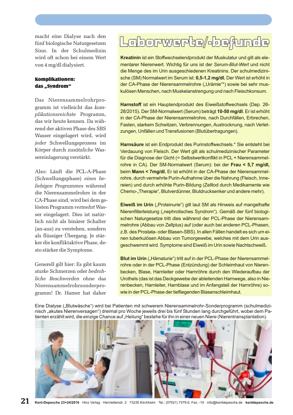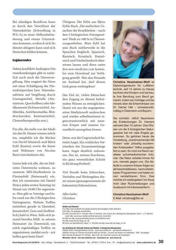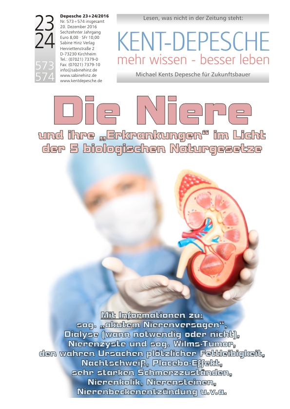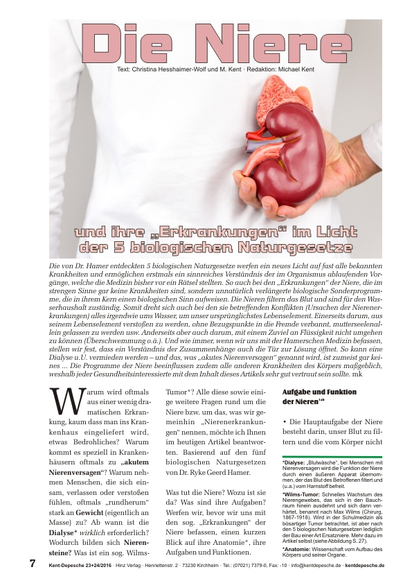 »Die von Dr. Hamer entdeckten 5 biologischen Naturgesetze werfen ein neues Licht auf fast alle bekannten Krankheiten und ermöglichen erstmals ein Verständnis der im Organismus ablaufenden Vorgänge, welche die Medizin bisher vor ein Rätsel stellten. So auch bei den „Erkrankungen“ der Niere, die im strengen Sinne gar keine Krankheiten sind, sondern unnatürlich verlängerte biologische Sonderprogramme, die in ihrem Kern einen biologischen Sinn aufweisen.