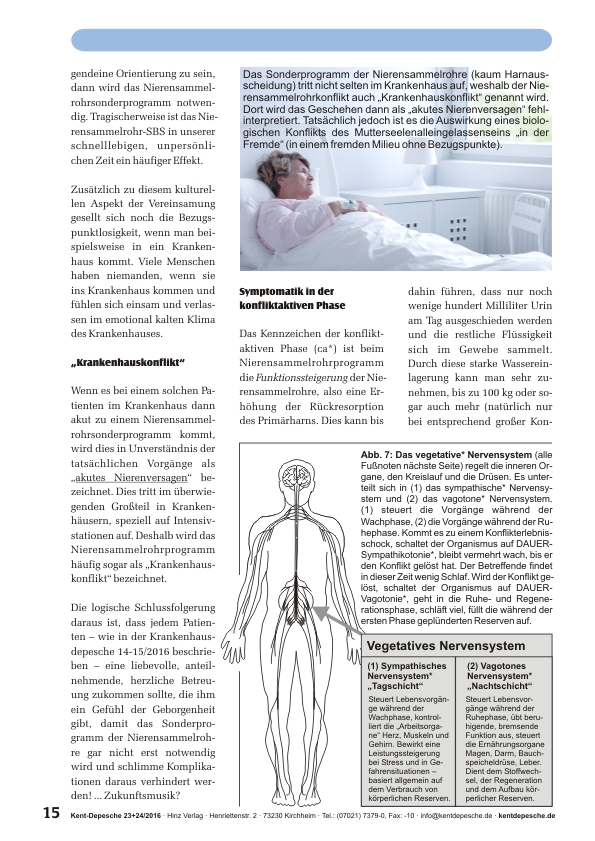 Die Nieren filtern das Blut und sind für den Wasserhaushalt zuständig. Somit dreht sich auch bei den sie betreffenden Konflikten (Ursachen der Nierenerkrankungen) alles irgendwie ums Wasser, um unser ursprünglichstes Lebenselement. Einerseits darum, aus seinem Lebenselement verstoßen zu werden, ohne Bezugspunkte in die Fremde verbannt, mutterseelenallein gelassen zu werden usw. Anderseits aber auch darum, mit einem Zuviel an Flüssigkeit nicht umgehen zu können (Überschwemmung o.ä.). Und wie immer, wenn wir uns mit der Hamerschen Medizin befassen, stellen wir fest, dass ein Verständnis der Zusammenhänge auch die Tür zur Lösung öffnet. So kann eine Dialyse u.U. vermieden werden – und das, was „akutes Nierenversagen“ genannt wird, ist zumeist gar keines ... Die Programme der Niere beeinflussen zudem alle anderen Krankheiten des Körpers maßgeblich, weshalb jeder Gesundheitsinteressierte mit dem Inhalt dieses Artikels sehr gut vertraut sein sollte.«