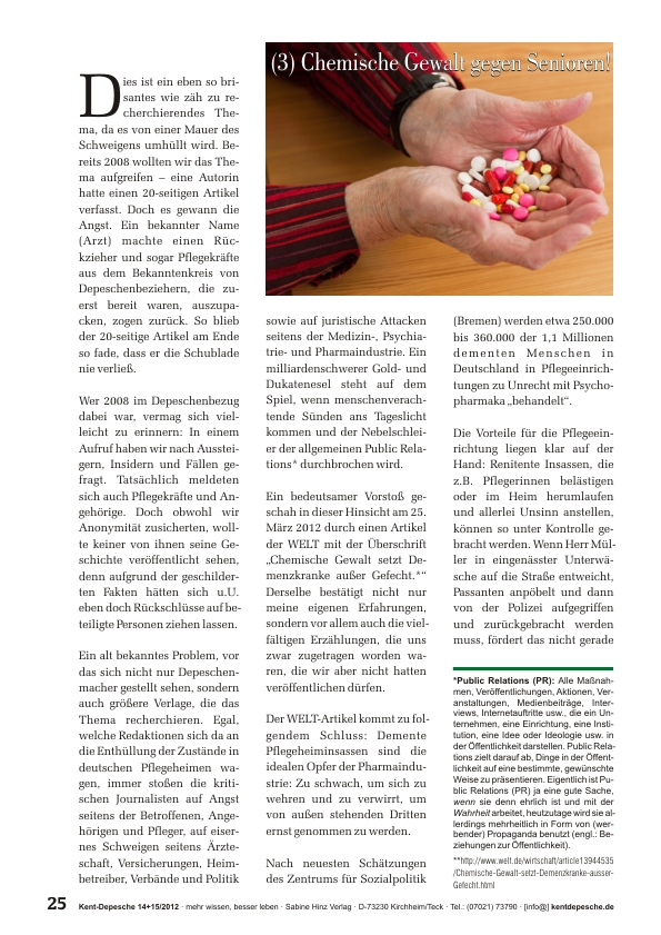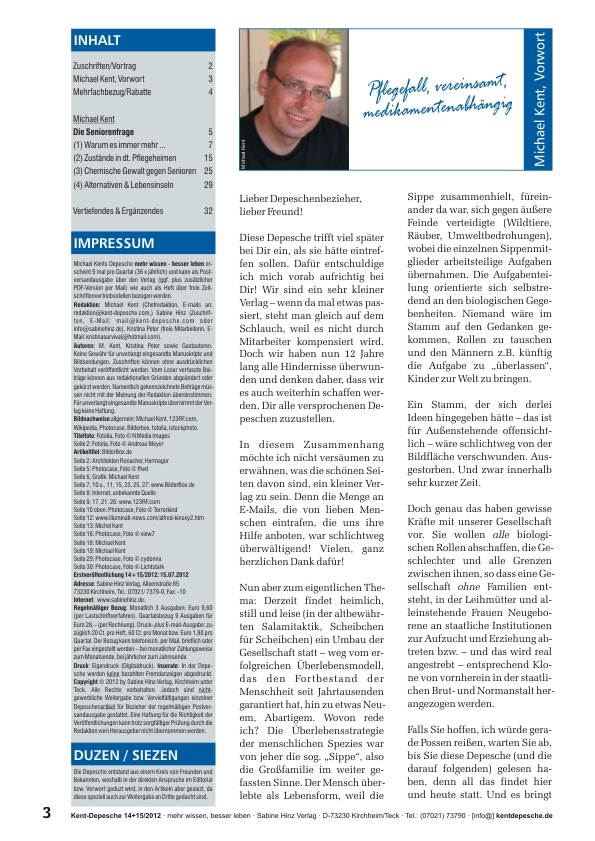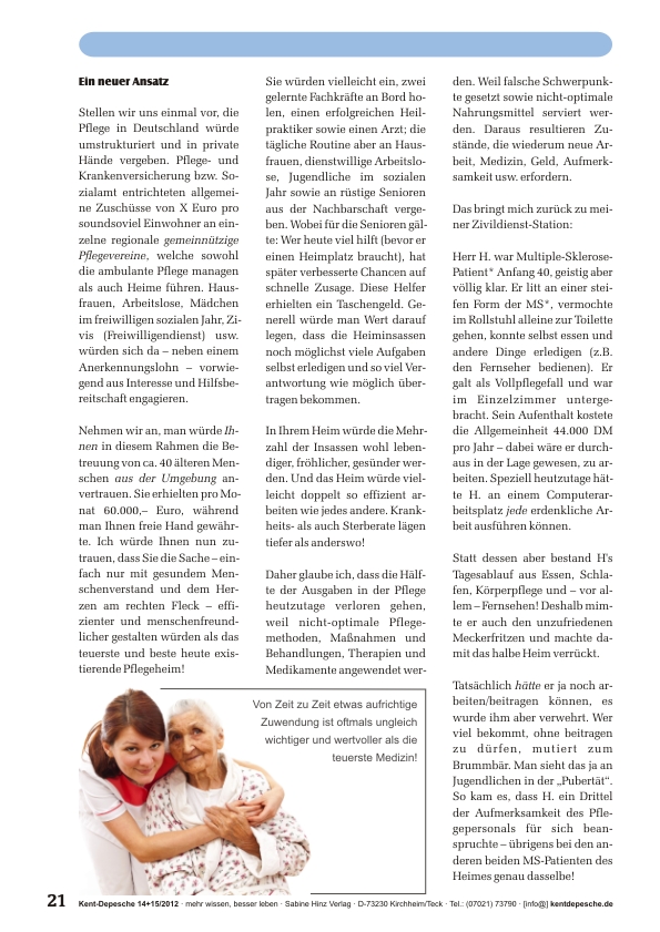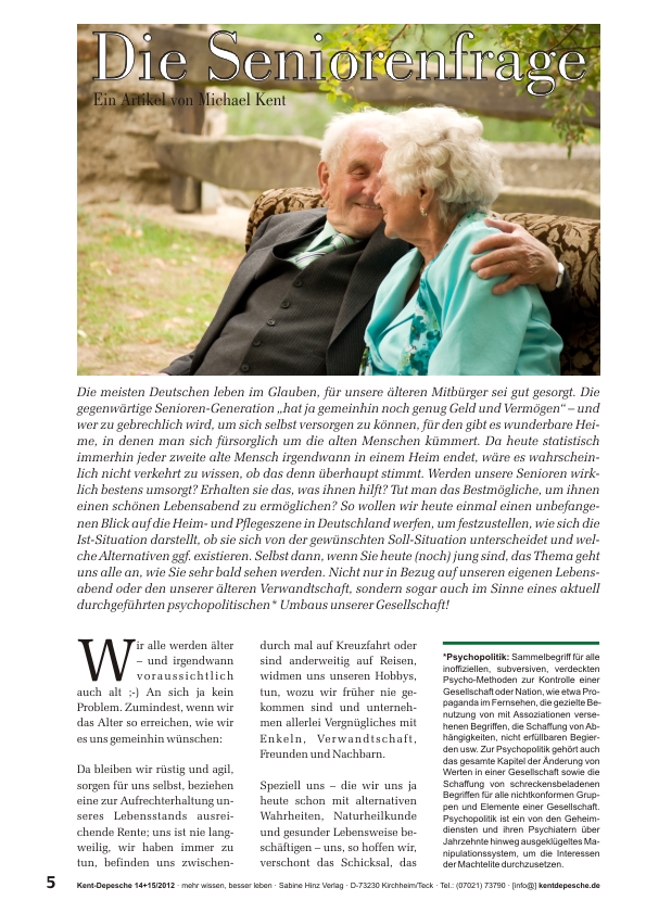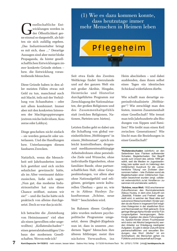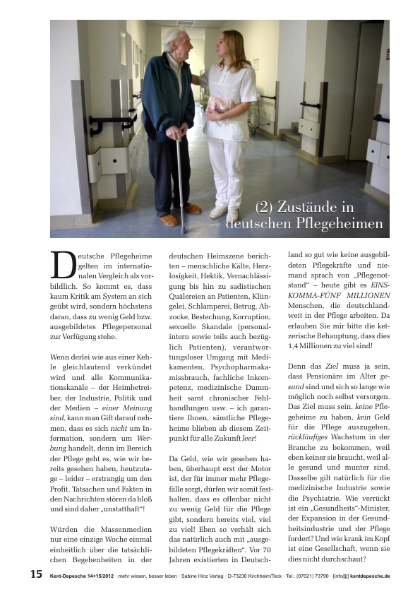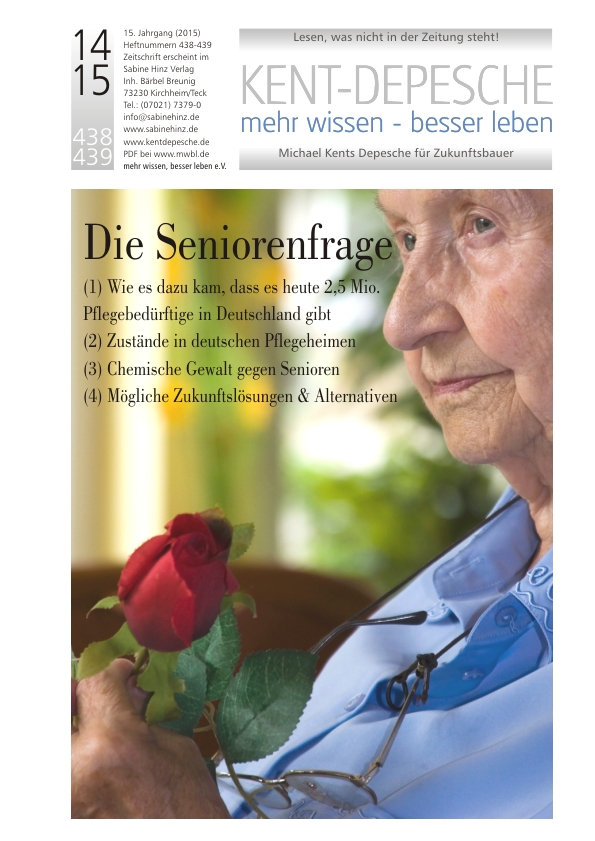 Die meisten Menschen glauben, für unsere älteren Mitbürger sei gut gesorgt. Wer zu gebrechlich wird, um sich selbst versorgen zu können, für den gibt es wunderbare Heime, in denen man sich fürsorglich um die Alten kümmert. Da heute statistisch immerhin jeder Zweite irgendwann im Heim endet, wäre es nicht verkehrt zu wissen, ob das denn überhaupt stimmt. Werden unsere Senioren wirklich bestens umsorgt? Erhalten sie das, was ihnen hilft? Tut man das Bestmögliche, um ihnen einen schönen Lebensabend zu ermöglichen? Lassen Sie uns daher einmal einen unbefangenen Blick auf die Heim- und Pflegeszene in Deutschland werfen, um festzustellen, wie sich die Ist-Situation darstellt, ob sie sich von der gewünschten Soll-Situation unterscheidet und welche Alternativen ggf. existieren. Selbst dann, wenn Sie heute (noch) jung sind, das Thema geht uns alle an. Nicht nur in Bezug auf unseren eigenen Lebensabend oder den unserer älteren Verwandtschaft, sondern sogar auch im Sinne eines aktuell durchgeführten Umbaus unserer Gesellschaft!