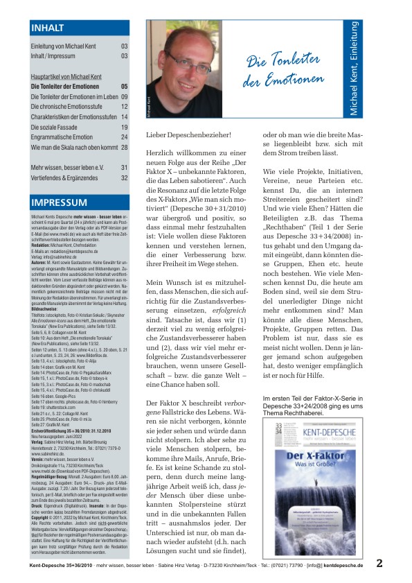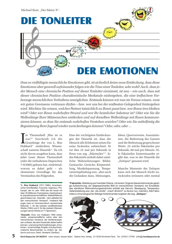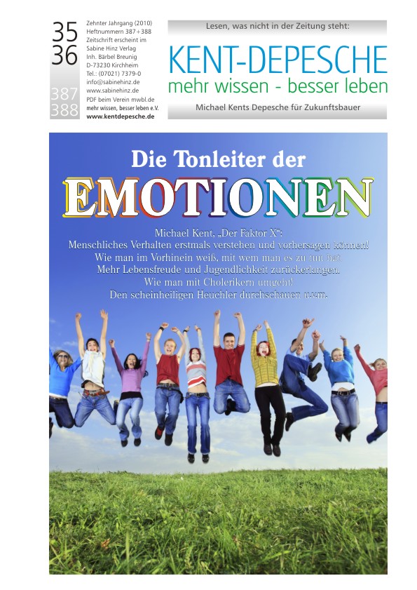 Dass es vielfältigste menschliche Emotionen gibt, ist sicherlich keine neue Entdeckung, dass diese Emotionen aber generell aufeinander folgen wie die Töne einer Tonleiter, sehr wohl! Auch, dass jeder Mensch eine chronische Position auf dieser Tonleiter einnimmt, ist neu, wie auch, dass mit dieser chronischen Position charakteristische Merkmale einhergehen, die eine treffsichere Vorhersage menschlichen Verhaltens ermöglichen. Erstmals können wir nun im Voraus wissen, wem wir guten Gewissens vertrauen dürfen – bzw. wer uns bei der erstbesten Gelegenheit hintergehen wird. Möchten Sie wissen, welcher Partner tatsächlich zu Ihnen passt bzw. wer Ihnen treu bleiben wird? Oder wer Ihnen wahrhafter Freund und wer Ihr heimlicher Saboteur ist? Oder wie Sie die Wellenlänge Ihrer Mitmenschen entdecken und auf derselben Wellenlänge mit Ihnen kommunizieren können, so dass Sie erstmals wahrhaftes Verstehen erzielen? Oder wie Sie mittelfristig die Begeisterung Ihrer Jugend wieder zurückerlangen können? Oder, oder, oder ...