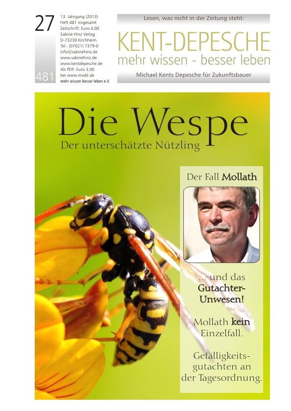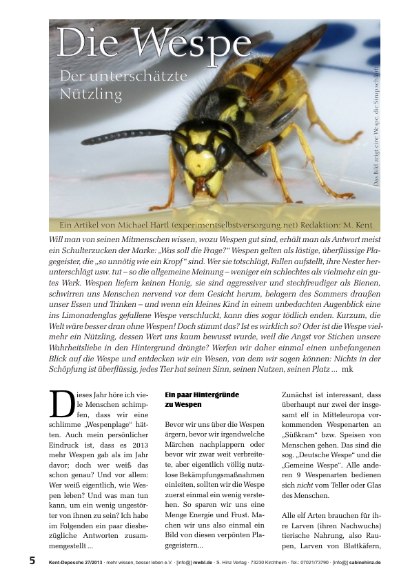 »Will man von seinen Mitmenschen wissen, wozu Wespen gut sind, erhält man als Antwort meist ein Schulterzucken der Marke: „Was soll die Frage?“ Wespen gelten als lästige, überflüssige Plagegeister, die „so unnötig wie ein Kropf“ sind. Wer sie totschlägt, Fallen aufstellt, ihre Nester herunterschlägt usw. tut – so die allgemeine Meinung – weniger ein schlechtes als vielmehr ein gutes Werk. Wespen liefern keinen Honig, sie sind aggressiver und stechfreudiger als Bienen, schwirren uns Menschen nervend vor dem Gesicht herum, belagern des Sommers draußen