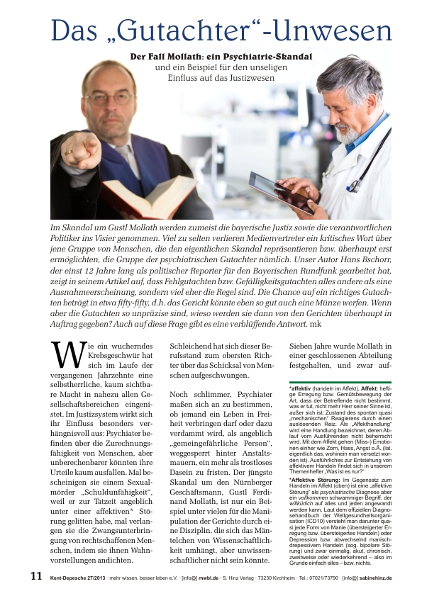 »Im Skandal um Gustl Mollath werden zumeist die bayerische Justiz sowie die verantwortlichen Politiker ins Visier genommen. Viel zu selten verlieren Medienvertreter ein kritisches Wort über jene Gruppe von Menschen, die den eigentlichen Skandal repräsentieren bzw. überhaupt erst ermöglichten, die Gruppe der psychiatrischen Gutachter nämlich. Unser Autor Hans Bschorr, der einst 12 Jahre lang als politischer Reporter für den Bayerischen Rundfunk gearbeitet hat, zeigt in seinem Artikel auf, dass Fehlgutachten bzw. Gefälligkeitsgutachten alles andere als eine Ausnahmeerscheinung, sondern viel eher die Regel sind. Die Chance auf ein richtiges Gutachten beträgt in etwa fifty-fifty, d.h. das Gericht könnte eben so gut auch eine Münze werfen. Wenn aber die Gutachten so unpräzise sind, wieso werden sie dann von den Gerichten überhaupt in Auftrag gegeben? Auch auf diese Frage gibt es eine verblüffende Antwort.«