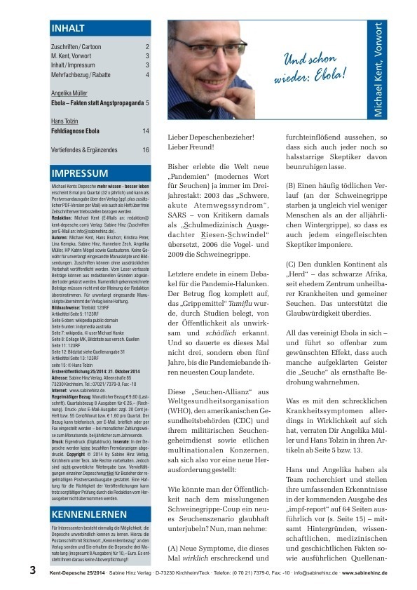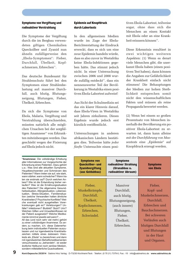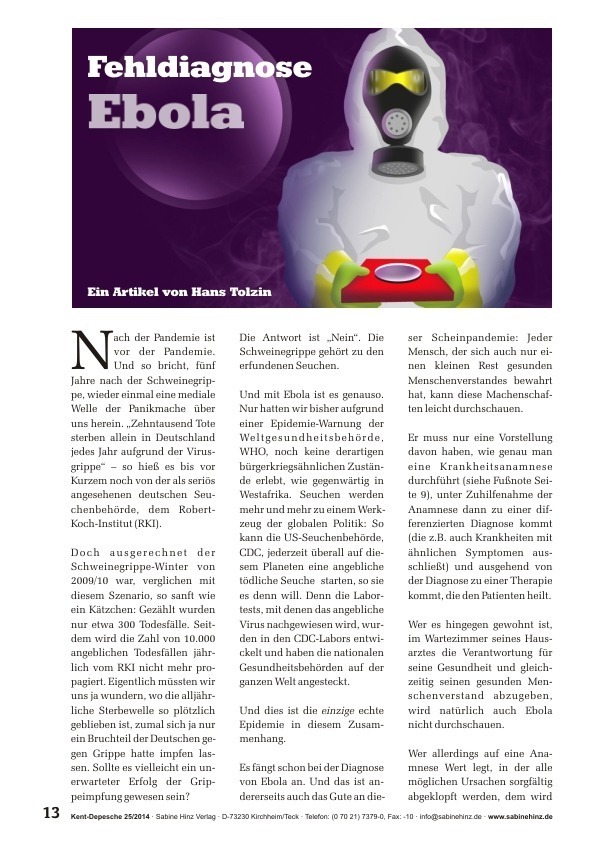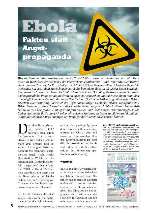 »Was ist diese ominöse Krankheit namens „Ebola“? Warum werden derzeit immer mehr Menschen in Westafrika krank? Wozu die Panikmache? Wem nutzt sie? Warum sieht man im Umkreis der Krankheit so viel Militär? Solche Fragen stellen sich dieser Tage viele Menschen mit gesundem Menschenverstand. Sie bemerken, dass an den Ebola-Berichten etwas nicht stimmen kann. Es fühlt sich an wie Krieg. Die völlig übertriebene und teilweise widersprüchliche Propaganda motiviert zu eigenen Recherchen. Angelika Müller hat in diesem Artikel die derzeit belegbaren Hintergrundinformationen und Erklärungen zusammengefasst. Sie bilden eine solide Basis, um sich selber eine eigene Meinung zu Ebola zu bilden und damit den Manipulationen der Angst erzeugenden Propaganda Widerstand leisten zu können.