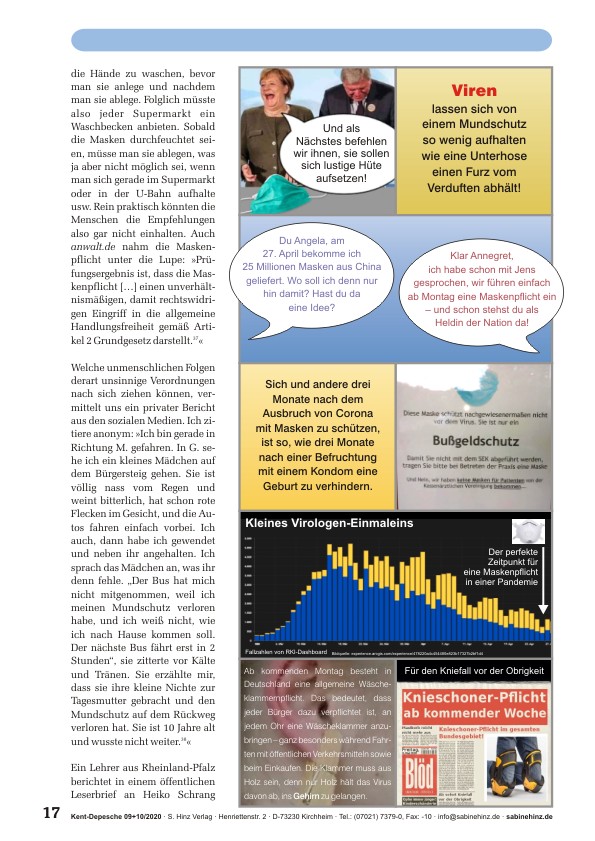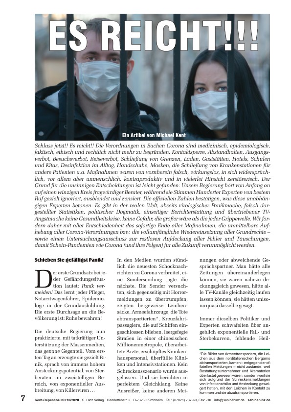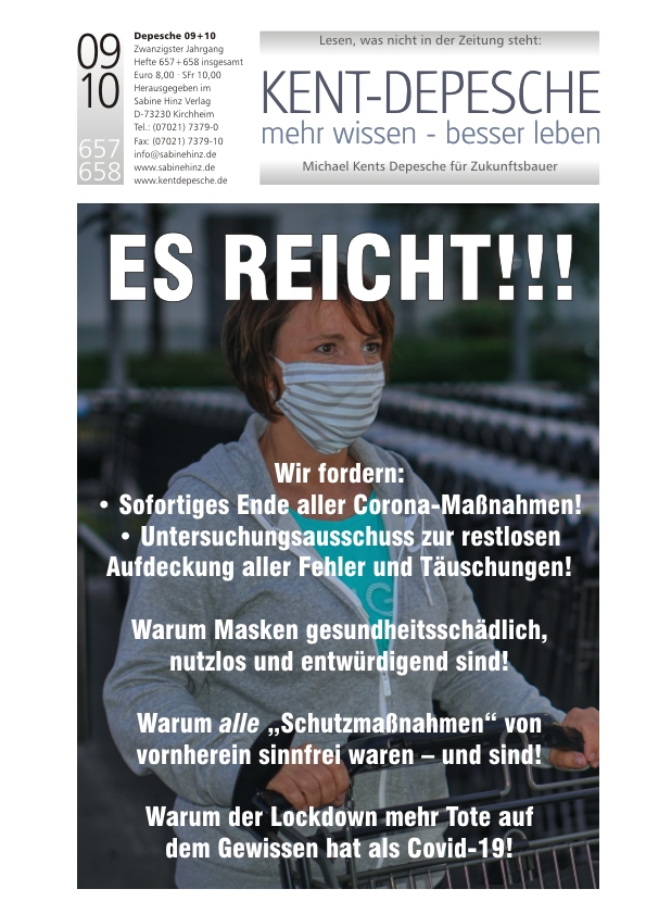 Schluss jetzt!! Es reicht!! Die Verordnungen in Sachen Corona sind medizinisch, epidemiologisch, faktisch, ethisch und rechtlich nicht mehr zu begründen. Kontaktsperre, Abstandhalten, Ausgangsverbot, Besuchsverbot, Reiseverbot, Schließung von Grenzen, Läden, Gaststätten, Hotels, Schulen und Kitas, Desinfektion im Alltag, Handschuhe, Masken, die Schließung von Krankenstationen für andere Patienten u.a. Maßnahmen waren von vornherein falsch, wirkungslos, in sich widersprüchlich, vor allem aber unmenschlich, kontraproduktiv und in vielerlei Hinsicht zerstörerisch. Der Grund für die unsinnigen Entscheidungen ist leicht gefunden: Unsere Regierung hört von Anfang an auf einen winzigen Kreis fragwürdiger Berater, während sie Stimmen Hunderter Experten von bestem