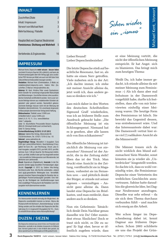 »Wie und warum sich bestimmte gesellschaftliche Strömungen durchsetzen, ist ein spannendes Studiengebiet. Dass sich eine Strömung als „die allgemeine Meinung der Bevölkerung“ durchsetzt, hat dabei in erster Linie mit penetranter Öffentlichkeitsarbeit zu tun, mit redaktioneller Werbung in den Massenmedien, mit Geld und mit den Interessen und Zielen der Mächtigen. Dass dies ausgerechnet beim „Feminismus“ nicht anders sein soll, ist auf den ersten Blick schwer nachvollziehbar, präsentiert er sich uns doch als „Bewegung aus dem Volke für das Volk“. Doch wenn wir ehrlich sind, müssen wir zugeben: Eigentlich hatten wir schon immer irgendwie ein ungutes Gefühl bei der Sache ...«