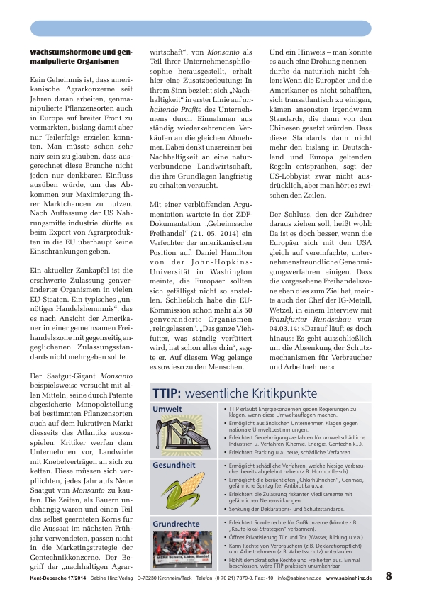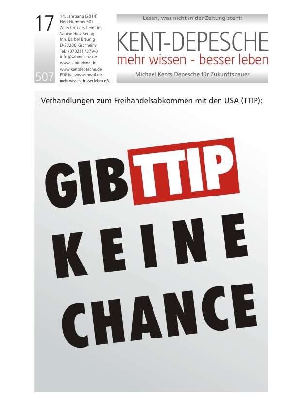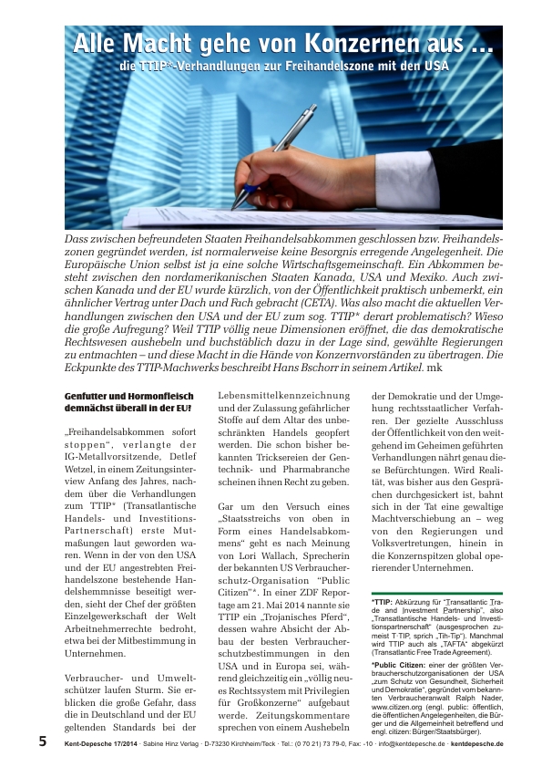 »Dass zwischen befreundeten Staaten Freihandelsabkommen geschlossen bzw. Freihandelszonen gegründet werden, ist normalerweise keine Besorgnis erregende Angelegenheit. Die Europäische Union selbst ist ja eine solche Wirtschaftsgemeinschaft. Ein Abkommen besteht zwischen den nordamerikanischen Staaten Kanada, USA und Mexiko. Auch zwischen Kanada und der EU wurde kürzlich, von der Öffentlichkeit praktisch unbemerkt, ein ähnlicher Vertrag unter Dach und Fach gebracht (CETA). Was also macht die aktuellen Verhandlungen zwischen den USA und der EU zum sog. TTIP* derart problematisch? Wieso die große Aufregung? Weil TTIP völlig neue Dimensionen eröffnet, die das demokratische Rechtswesen aushebeln und buchstäblich dazu in der Lage sind, gewählte Regierungen zu entmachten – und diese Macht in die Hände von Konzernvorständen zu übertragen. Die Eckpunkte des TTIP-Machwerks beschreibt Hans Bschorr in seinem Artikel.«