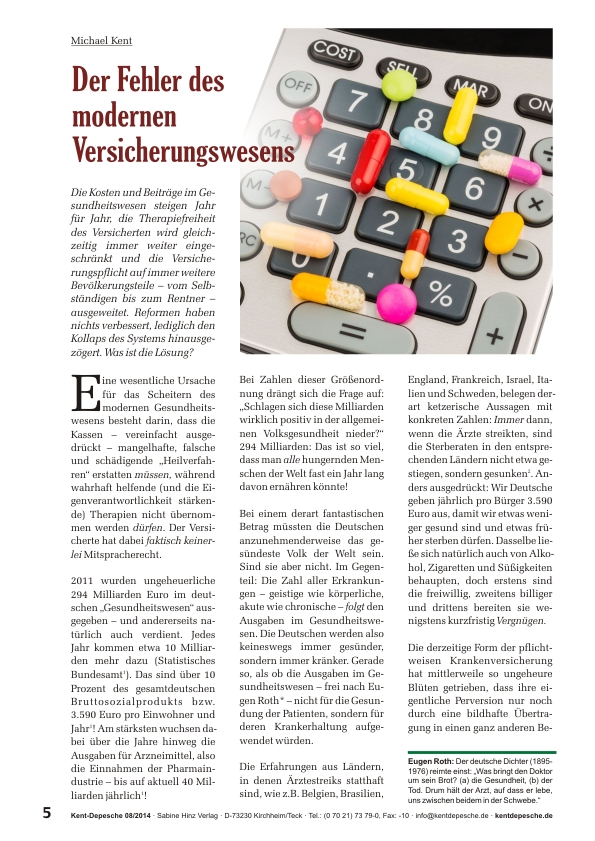 »Die Kosten und Beiträge im Gesundheitswesen steigen Jahr für Jahr, die Therapiefreiheit des Versicherten wird gleichzeitig immer weiter eingeschränkt und die Versicherungspflicht auf immer weitere Bevölkerungsteile – vom Selbständigen bis zum Rentner – ausgeweitet. Reformen haben nichts verbessert, lediglich den Kollaps des Systems hinausgezögert. Was ist die Lösung?«
