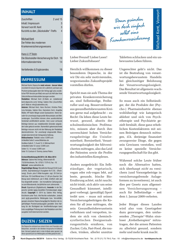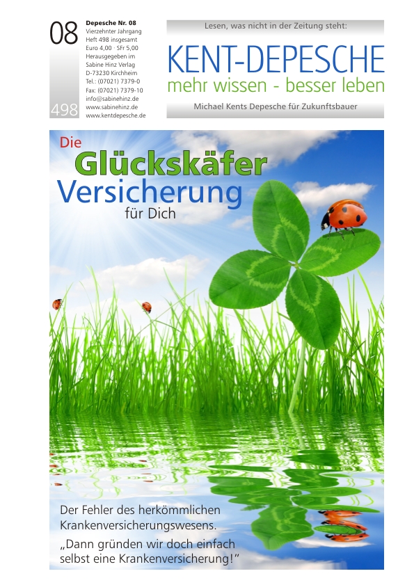 »Eigentlich liegt auch den gesetzlichen und den privaten Krankenkassen der Solidaritätsgedanke zugrunde: Gerät jemand in gesundheitliche Not und kann die manchmal sehr hohen Behandlungskosten nicht aufbringen, springt die Gemeinschaft für ihn ein. Doch die fehlende Bereitschaft vieler, Verantwortung für die eigene Gesundheit zu übernehmen und die Begehrlichkeiten diverser Interessengruppen haben im Laufe der Jahrzehnte dazu geführt, dass „das System“ uns immer weniger Mitsprache zugesteht. Und so kommt es, dass von unseren in der Regel mit Fleiß erarbeiteten Krankenversicherungsbeiträgen viele überteuerte Therapien bezahlt werden, die gar nicht helfen oder sogar das Gegenteil von Gesundheit bewirken. Und dass wir alternative vorbeugende Maßnahmen, Behandlungskonzepte, Therapien und Therapeuten, denen wir vertrauen, zusätzlich aus eigener Tasche zahlen müssen. Doch nun ist durch ein völlig neues Versicherungskonzept Abhilfe in Sicht – zumindest für Selbständige und freiwillig gesetzlich Versicherte, die es gewohnt sind, selbst Verantwortung für ihre Gesundheit zu übernehmen: Die Glückskäfer-Versicherung.«