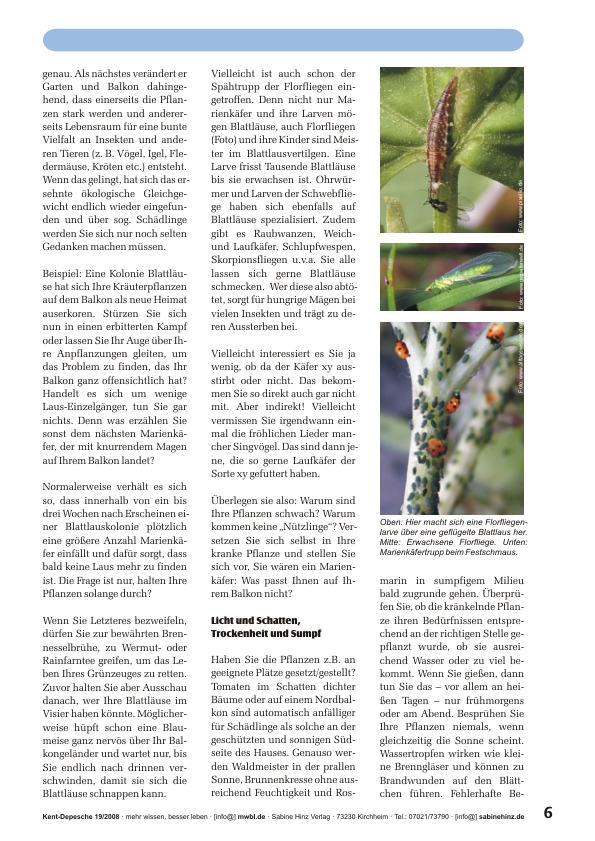 »Eigentlich sollte das Thema heute „Natürliche Schädlingsbekämpfung“ heißen. Aber da es ja „Schädlinge“ gar nicht wirklich gibt (wie wir gleich sehen werden), sondern nur ein aus den Fugen geratenes ökologisches Gleichgewicht aufgrund menschlicher Fehler, kann man auch niemanden bekämpfen – ob nun auf natürliche oder unnatürliche Art (nur der Einfachheit halber verwende ich im Text dennoch die Begriffe „Schädlinge“ und „Nützlinge“). Wie aber kann das verschwundene ökologische Gleichgewicht wieder in den Garten und auf den Balkon gelockt werden?«