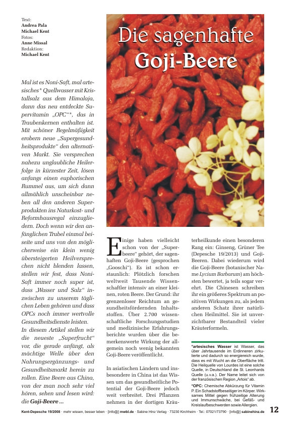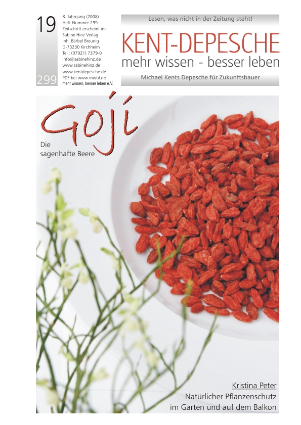 »Mal ist es Noni-Saft, mal artesisches Quellwasser mit Kristallsalz aus dem Himalaja, dann das neu entdeckte Supervitamin „OPC“, das in Traubenkernen enthalten ist. Mit schöner Regelmäßigkeit erobern neue „Supergesundheitsprodukte“ den alternativen Markt. Sie versprechen nahezu unglaubliche Heilerfolge in kürzester Zeit, lösen anfangs einen euphorischen Rummel aus, um sich dann allmählich unscheinbar neben all den anderen Superprodukten ins Naturkost- und Reformhausregal einzugliedern. Doch wenn wir den anfänglichen Trubel einmal beiseite und uns von den möglicherweise ein klein wenig übersteigerten Heilversprechen nicht blenden lassen, stellen wir fest, dass Noni-Saft immer noch super ist, dass „Wasser und Salz“ inzwischen zu unserem täglichen Leben gehören und dass OPCs noch immer wertvolle Gesundheitsdienste leisten. In diesem Artikel stellen wir die neueste „Superfrucht“ vor, die gerade anfängt, als mächtige Welle über den Nahrungsergänzungs- und Gesundheitsmarkt herein zu rollen. Eine Beere aus China, von der man noch sehr viel hören, sehen und lesen wird: die Goji-Beere …«