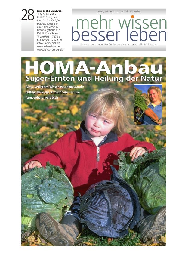 Das HOMA Verfahren basiert auf den altindischen Weisheitsschriften, den Veden. „Obwohl“ das Verfahren für westliche Augen und Ohren „esoterisch“ anmutet, sind die Ergebnisse sehr zufriedenstellend bis geradezu sensationell: Bessere Wasserspeicherung des Bodens, höhere Erträge, Resistenz gegen Schädlinge, größere und wohlschmeckendere Früchte und Gemüse, Rettung von sauren Böden und Wäldern, bessere Wurzelbildung und somit Standfestigkeit bei Sturm. In Südamerika wurde durch HOMA-Anwendung sogar ein chemisch vergiftetes Gebiet von mehreren Quadratkilometern Fläche, das – durch Wissenschaftsexperten aus aller Herren Länder schriftlich bestätigt – „100 Jahre lang nicht landwirtschaftlich nutzbar sein wird“, innerhalb von nur wenigen Monaten geheilt. Heute gedeiht dort sogar mehr als jemals zuvor.