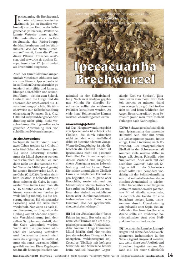• Homöopathische Hausapotheke (Folge 23): Arzneimittelbild von Ipecacuanha (südamerikamnische Brechwurzel) bei schwerer Übelkeit, Reisekrankheit, Schwangerschaftsübelkeit, Menstruationsbeschwerden u.v.a.
