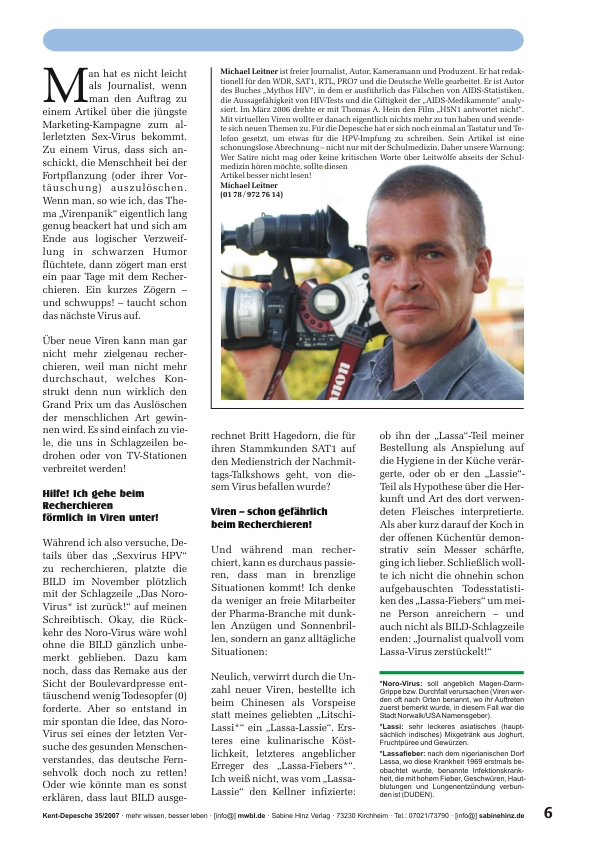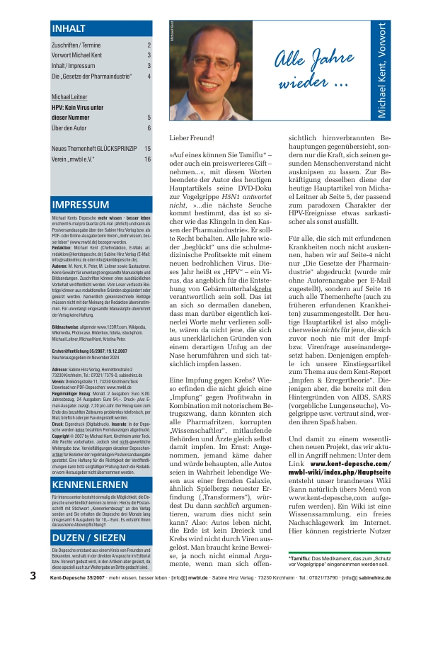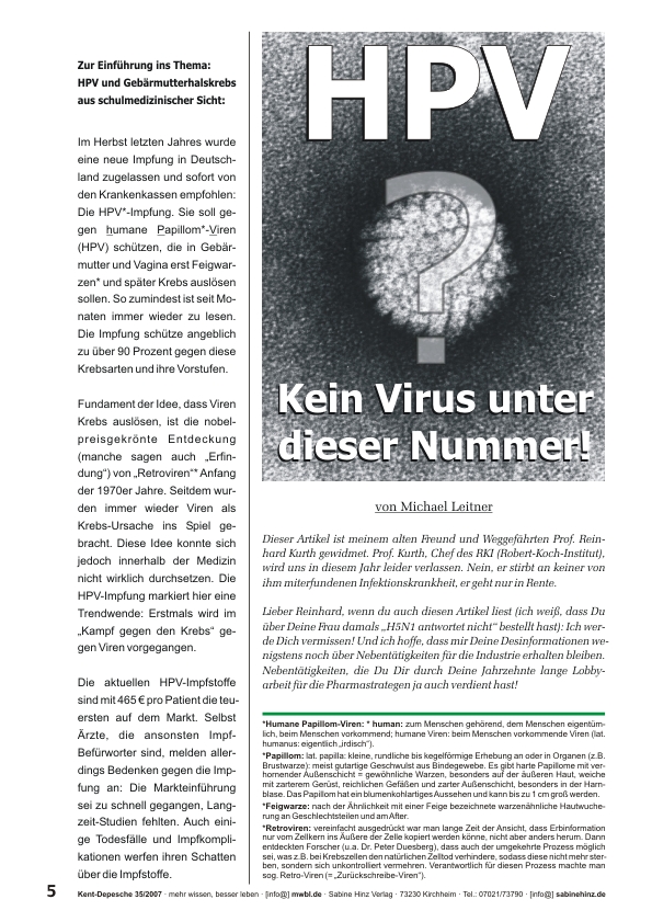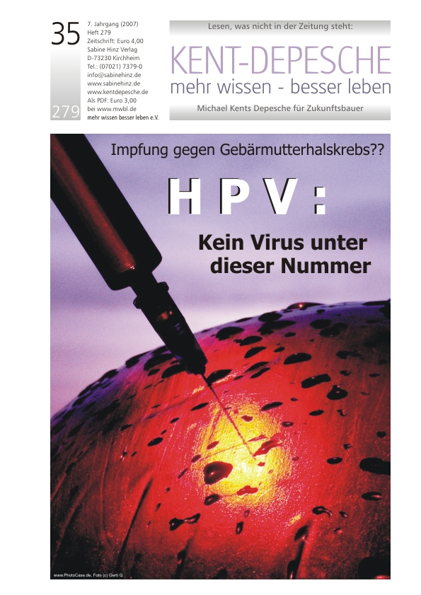 »Im Herbst letzten Jahres wurde eine neue Impfung in Deutschland zugelassen und sofort von den Krankenkassen empfohlen: Die HPV-Impfung. Sie soll gegen humane Papillom-Viren (HPV) schützen, die in Gebärmutter und Vagina erst Feigwarzen und später Krebs auslösen sollen. So zumindest ist seit Monaten immer wieder zu lesen. Die Impfung schütze angeblich zu über 90 Prozent gegen diese Krebsarten und ihre Vorstufen. Fundament der Idee, dass Viren Krebs auslösen, ist die nobelpreisgekrönte Entdeckung (manche sagen auch „Erfindung“) von „Retroviren“ Anfang der 1970er Jahre. Seitdem wurden immer wieder Viren als Krebs-Ursache ins Spiel gebracht. Diese Idee konnte sich jedoch innerhalb der Medizin nicht wirklich durchsetzen. Die HPV-Impfung markiert hier eine Trendwende: Erstmals wird im „Kampf gegen den Krebs“ gegen Viren vorgegangen. Die aktuellen HPV-Impfstoffe sind mit 465 € pro Patient die teuersten auf dem Markt. Selbst Ärzte, die ansonsten Impf-Befürworter sind, melden allerdings Bedenken gegen die Impfung an: Die Markteinführung sei zu schnell gegangen, Langzeit-Studien fehlten. Auch einige Todesfälle und Impfkomplikationen werfen ihren Schatten über die Impfstoffe.«