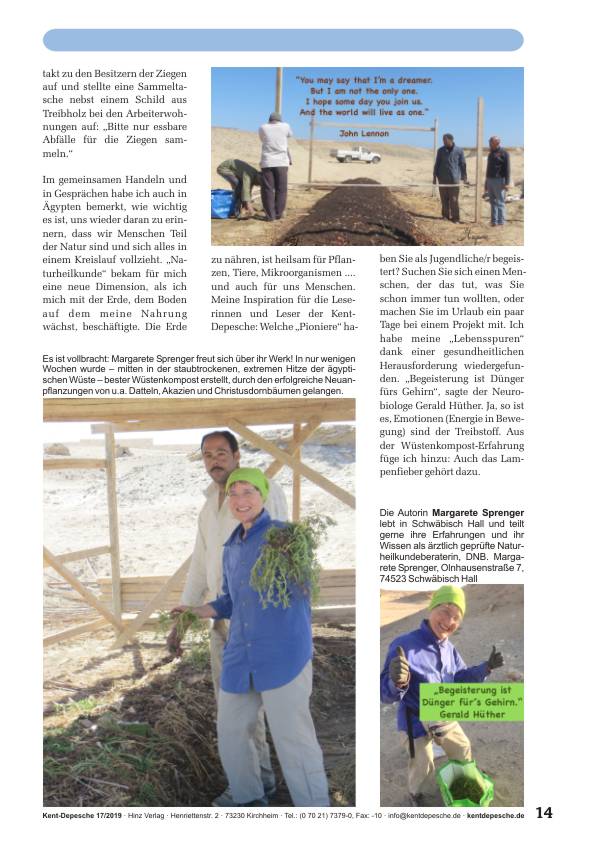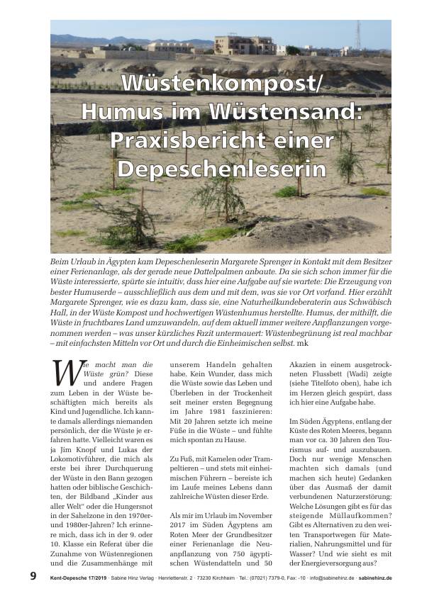 Praxisbericht: Margarete Sprenger beschreibt, wie sie selbst aktive Wüstenbegrünung betrieben und besten Humus bzw. Kompost in der Wüste hergestellt hat – ausschließlich mit dem, was vor Ort erhältlich war. Ihr Bericht ist hoffnungsvoll, positiv, ermutigend und untermauert unser kürzliches Fazit: Wüstenbegrünung ist real machbar, mit einfachen Mitteln vor Ort, durch Einheimische.