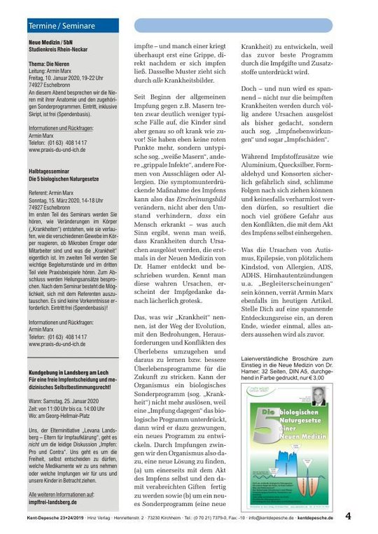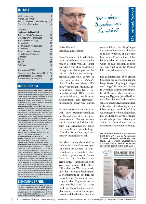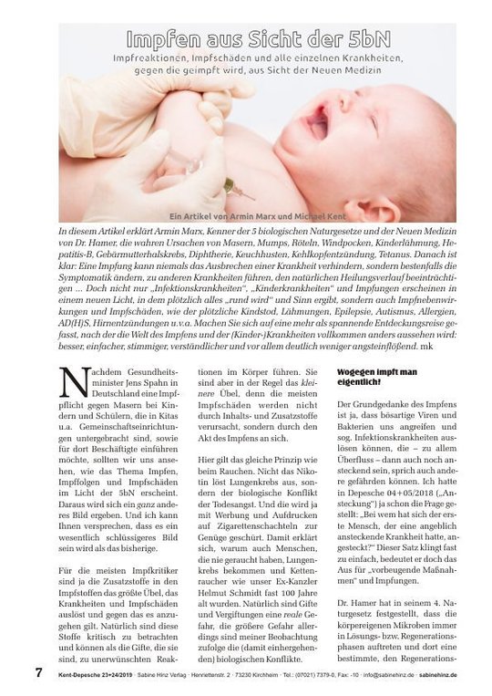Unser Autor, Armin Marx, beschreibt die Ursachen von Masern, Mumps, Ohrspeicheldrüsenentzündung, Röteln, Windpocken, Kinderlähmung (Polio), Hepatitis-B, Gebärmutterhalskrebs (HPV), Diphtherie, Echter Krupp-Husten, Keuchhusten, Kehlkopfentzündung, Tetanus … aus Sicht der 5 biologischen Naturgesetze (5bN von Dr. Hamer). Danach ist klar: Eine Impfung kann niemals das Ausbrechen einer Krankheit verhindern, sondern bestenfalls die Symptomatik ändern, zu anderen Krankheiten führen, den natürlichen Heilungsverlauf beeinträchtigen ... Doch nicht nur „Infektionskrankheiten“, „Kinderkrankheiten“ und Impfungen erscheinen in einem neuen Licht, sondern auch Impfnebenwirkungen und Impfschäden, wie der plötzliche Kindstod, Lähmungen, Epilepsie, Autismus, Allergien, AD(H)S, Hirnentzündungen u.a.