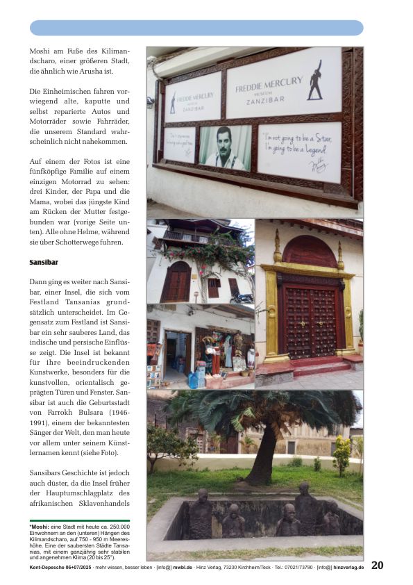 Es gibt Länder, die einen vom ersten Moment an in ihren Bann ziehen — Tansania gehört für mich unbedingt dazu. Dieses Land in Ostafrika, zwischen Kenia, Mosambik und dem Indischen Ozean gelegen, ist so reich an faszinierenden Naturwundern, Geschichte und Sehenswürdigkeiten, dass eine einzige Reise kaum ausreicht, um es in seiner Vielfalt zu erfassen. Im Herbst 2024 machte sich die Depeschenbezieherin Astrid Fuchs auf den Weg, um Tansania zu entdecken. Sie reiste quer durchs Land, durch Savannen und quirlige Städte, hinauf auf beeindruckende Hochplateaus und hinaus auf die Insel Sansibar. Der Reisebericht, den Astrid liebevoll zusammengestellt hat, ist mehr als eine Aneinanderreihung schöner Bilder. Er ist eine Einladung, Tansania mit offenen Augen zu erleben — das Ursprüngliche, das Schöne, aber auch das Unerwartete und manchmal Widersprüchliche. Freuen Sie sich auf eine spannende Entdeckungsreise, zwischen faszinierender Gegenwart und bewegter Geschichte — und auf Einblicke in ein Afrika, die über die übliche Postkartenidylle hinausgehen.