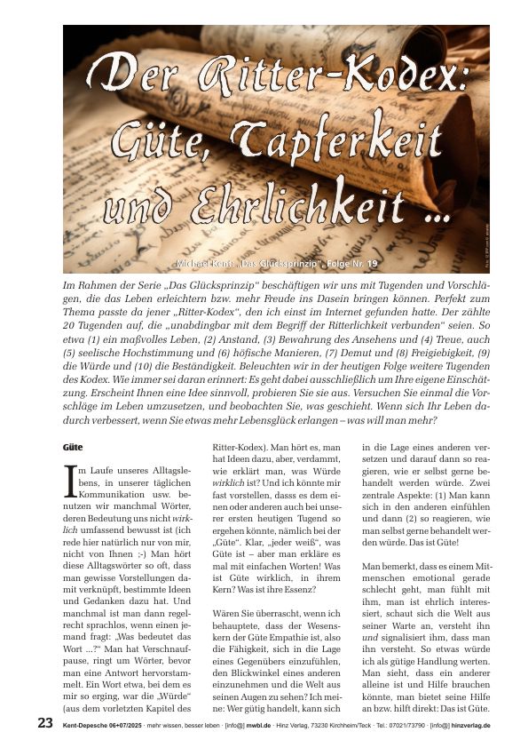 Leserstimme: »Was für ein kraftvoller, kluger und tiefgründiger Artikel! Dein Text beleuchtet die Tugenden Güte, Tapferkeit und Ehrlichkeit auf eine wunderbar menschliche und zugleich alltagsnahe Weise. Mit vielen Beispielen, einem charmanten Ton und einer Prise Humor – das liest sich nicht nur gut, sondern regt auch zum Nachdenken an. Großes Kompliment!«