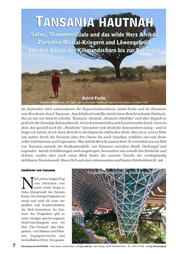 Es gibt Länder, die einen vom ersten Moment an in ihren Bann ziehen — Tansania gehört für mich unbedingt dazu. Dieses Land in Ostafrika, zwischen Kenia, Mosambik und dem Indischen Ozean gelegen, ist so reich an faszinierenden Naturwundern, Geschichte und Sehenswürdigkeiten, dass eine einzige Reise kaum ausreicht, um es in seiner Vielfalt zu erfassen. Im Herbst 2024 machte sich die Depeschenbezieherin Astrid Fuchs auf den Weg, um Tansania zu entdecken. Sie reiste quer durchs Land, durch Savannen und quirlige Städte, hinauf auf beeindruckende Hochplateaus und hinaus auf die Insel Sansibar. Der Reisebericht, den Astrid liebevoll zusammengestellt hat, ist mehr als eine Aneinanderreihung schöner Bilder. Er ist eine Einladung, Tansania mit offenen Augen zu erleben — das Ursprüngliche, das Schöne, aber auch das Unerwartete und manchmal Widersprüchliche. Freuen Sie sich auf eine spannende Entdeckungsreise, zwischen faszinierender Gegenwart und bewegter Geschichte — und auf Einblicke in ein Afrika, die über die übliche Postkartenidylle hinausgehen.