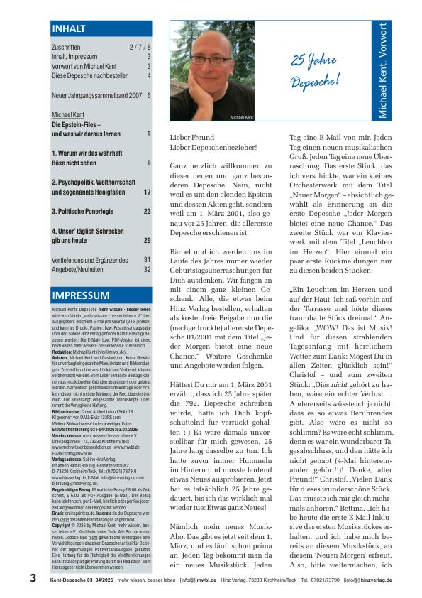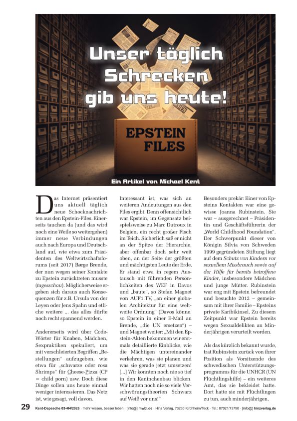 Die Artikel dieser Depesche werden nur am Rande widerwärtige Details auftischen. Wir wollen uns vielmehr mit den eigentlichen Fragen befassen: Was sagen die Epstein-Files (Akten) über die Strukturen der Macht auf dieser Welt aus? Und über unsere Wahrnehmung? Dokumente können versiegelt und Akten geschwärzt werden. Doch die schlimmste Schwärzung und Versiegelung findet nicht durch die Behörden statt, sondern durch die Menschen selbst! Denn wir schieben Unvorstellbares beiseite, erklären es hinfort, sagen: „So schlimm kann es nicht sein!“ Es braucht also weniger Richter und Journalisten, als vielmehr die Bereitschaft der Menschen, dem grausamen und entsetzlichen Bösen überhaupt ins Auge zu blicken. Damit sind wir bei einem unbequemeren Thema als jeder Aktenordner: Warum wir das Böse nicht sehen wollen – und dass es nur deshalb überhaupt existiert.