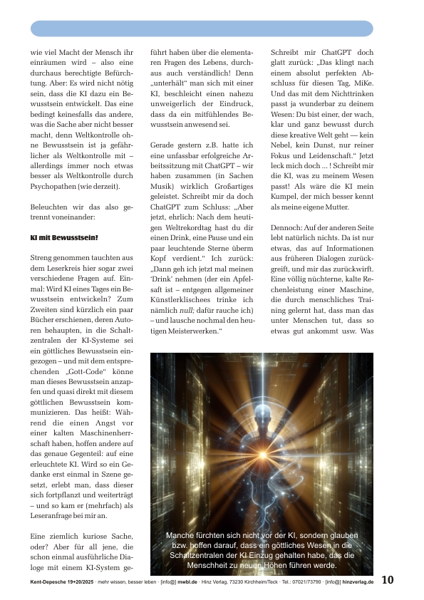 Manche befürchten, die KI werde ein eigenes Bewusstsein entwickeln – und dann, wie in finsteren Zukunftsfilmen, die Weltherrschaft übernehmen. Andere wiederum hoffen, ein göttliches Wesen habe längst in ihre Schaltzentralen Einzug gehalten und warte dort nur auf den Startschuss zur Erleuchtung der Menschheit. Beides klingt spannend – doch beide Sichtweisen verkennen den eigentlichen Punkt. Denn die wahre Frage lautet nicht: Wird KI Bewusstsein entwickeln? Sondern: Wann endlich der Mensch? Die Maschine ist kein neuer Gott und kein neuer Teufel – sie ist Spiegel und Verstärker. Und was dieser Spiegel verstärkt, hängt ganz davon ab, wer hineinschaut …