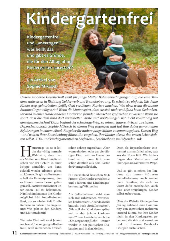 Die moderne Gesellschaft stellt für junge Mütter Rahmenbedingungen auf, die eine Tendenz aufweisen in Richtung Gelderwerb und Fremdbetreuung: Gib deine Kinder weg, geh arbeiten, Geld verdienen, Karriere machen! Was aber, wenn die innere Stimme Gegenteiliges rät? Wenn die junge Mutter spürt, dass sie sich nicht wohlfühlt beim Gedanken, ihr Kind in einer Horde anderer von Fremden großziehen zu lassen? Oder wenn die dem Kind dort vermittelten Werte und Vorstellungen sich nicht mit den eigenen decken? Dann beginnt der schwierige Weg, zu seinem inneren Wissen zu stehen. Sophie Mikosch ist diesen Weg gegangen. Was zu ihrer Entscheidung führte, ihre Kinder in den ersten Lebensjahren selbst – KiTa- und kindergartenfrei zu begleiten –, beschreibt sie in dieser Depesche.