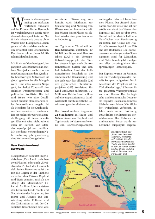 »Wasser ist die mengenmäßig am stärksten vertretene Substanz auf der Erdoberfläche. Dennoch ist vergleichsweise wenig über diesen Lebensquell bekannt. Natürlich wissen wir, dass es ohne Wasser kein biologisches Leben geben würde und dass auch nur ein Bruchteil aller chemischen Reaktionen ohne dieses Multitalent ablaufen könnte. Mit Blick auf den heutigen Umgang mit Wasser könnte das kostbare Nass jedoch auch zu unserem Untergang werden. Qualitativ hochwertiges Süßwasser ist global gesehen bereits Mangelware – und alles, was zur Neige geht, beinhaltet Zündstoff hinsichtlich Profitinteressen und politischer Konflikte. Die Art und Weise, wie eine Gesellschaft mit dem elementarsten aller Lebenselixiere umgeht, ist als Messlatte für die Qualität ihres Bewusstseins zu verstehen. Der oft nicht sehr wertschätzende Umgang mit diesem wichtigen Element wird nicht zuletzt auch im Bereich von Staudammgroßprojekten deutlich. Mit der damit verbundenen Naturzerstörung geht gleichzeitig eine Kulturzerstörung einher.«