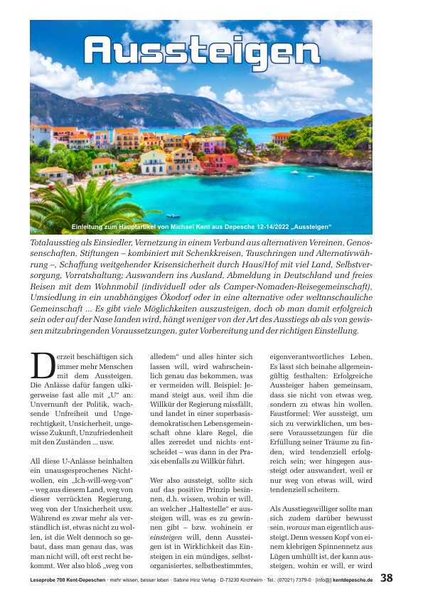 »Totalausstieg, Einsiedler, Vernetzung im Verbund aus alternativen Vereinen, Genossenschaften, Stiftungen – kombiniert mit Schenkkreisen, Tauschringen und Alternativwährung –, Schaffung von Krisensicherheit durch Haus/Hof mit viel Land, Selbstversorgung, Vorratshaltung; Auswandern ins Ausland, Abmeldung in Deutschland und freies Reisen mit dem Wohnmobil (individuell oder als Camper-Nomaden-Reisegemeinschaft), Umsiedlung in ein unabhängiges Ökodorf oder in eine alternative oder weltanschauliche Gemeinschaft ... Es gibt viele Möglichkeiten auszusteigen, doch ob man damit erfolgreich sein oder auf der Nase landen wird, hängt weniger von der Art des Ausstiegs ab als von gewissen mitzubringenden Voraussetzungen, guter Vorbereitung und der richtigen Einstellung.«