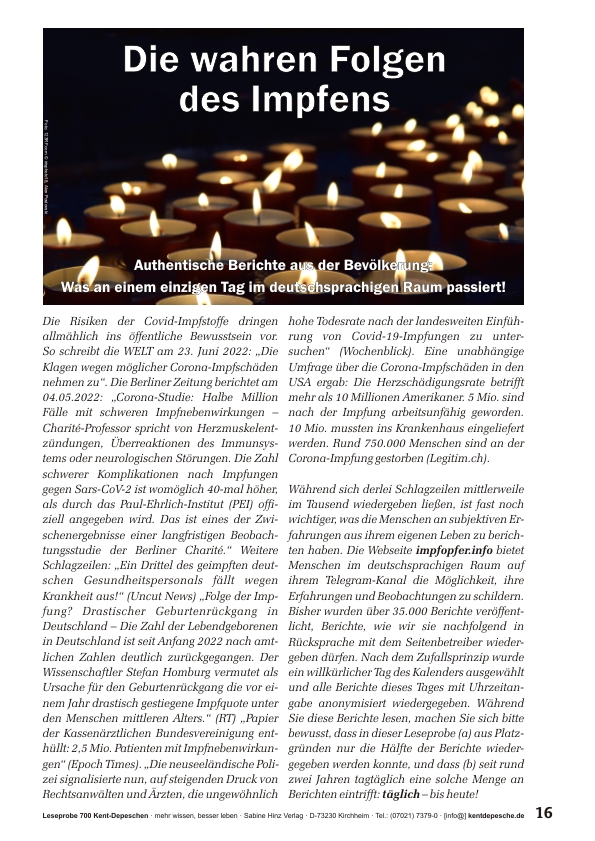 »Während sich schockierende Schlagzeilen über die Auswirkungen der C-Spritze mittlerweile im Tausend wiedergeben ließen, ist fast noch wichtiger, was die Menschen an subjektiven Erfahrungen aus ihrem eigenen Leben zu berichten haben. Die Webseite impfopfer.info bietet Menschen im deutschsprachigen Raum auf ihrem Telegram-Kanal die Möglichkeit, ihre Erfahrungen und Beobachtungen zu schildern. Bisher wurden über 35.000 Berichte veröffentlicht, Berichte, wie wir sie nachfolgend in Rücksprache mit dem Seitenbetreiber wiedergeben dürfen. Nach dem Zufallsprinzip wurde ein willkürlicher Tag des Kalenders ausgewählt und alle Berichte dieses Tages mit Uhrzeitangabe anonymisiert wiedergegeben. Während Sie diese Berichte lesen, machen Sie sich bitte bewusst, dass in dieser Leseprobe (a) aus Platzgründen nur die Hälfte der Berichte wieder-gegeben werden konnte, und dass (b) seit rund zwei Jahren tagtäglich eine solche Menge an Berichten eintrifft: täglich – bis heute!«
