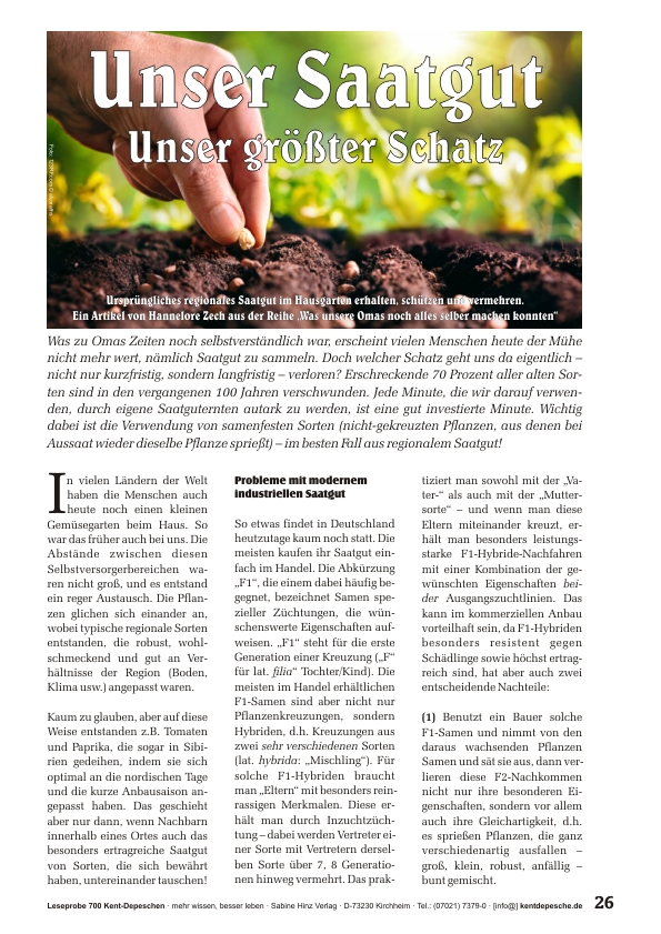 »Was zu Omas Zeiten noch selbstverständlich war, erscheint vielen Menschen heute der Mühe nicht mehr wert, nämlich Saatgut zu sammeln. Doch welcher Schatz geht uns da eigentlich – nicht nur kurzfristig, sondern langfristig – verloren? Erschreckende 70 Prozent aller alten Sorten sind in den vergangenen 100 Jahren verschwunden. Jede Minute, die wir darauf verwenden, durch eigene Saatguternten autark zu werden, ist eine gut investierte Minute. Wichtig dabei ist die Verwendung von samenfesten Sorten (nicht-gekreuzten Pflanzen, aus denen bei Aussaat wieder dieselbe Pflanze sprießt) – im besten Fall aus regionalem Saatgut!«