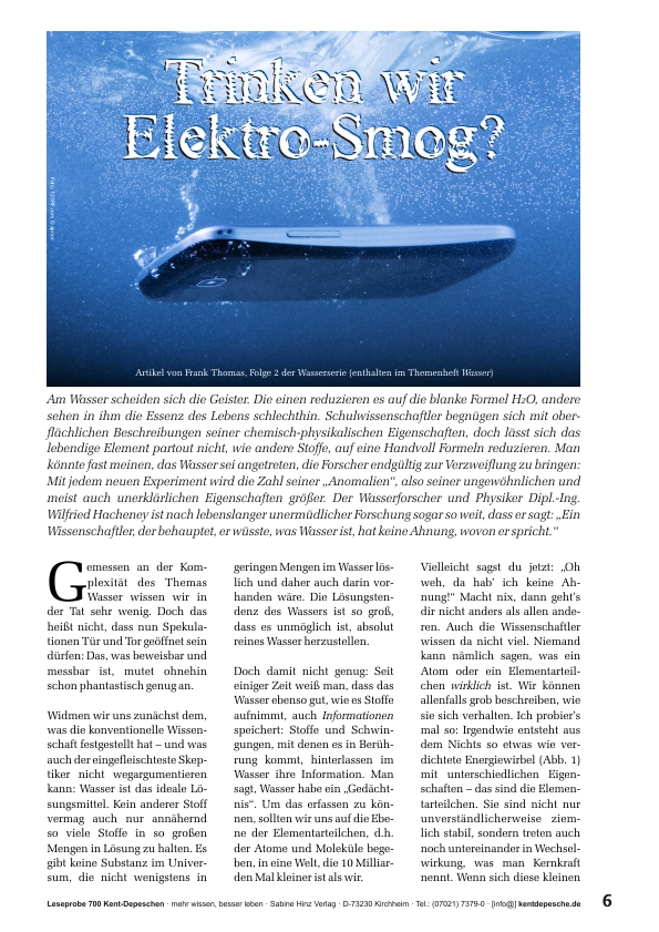 »Am Wasser scheiden sich die Geister. Die einen reduzieren es auf die blanke Formel H2O, andere sehen in ihm die Essenz des Lebens schlechthin. Schulwissenschaftler begnügen sich mit oberflächlichen Beschreibungen seiner chemisch-physikalischen Eigenschaften, doch lässt sich das lebendige Element partout nicht, wie andere Stoffe, auf eine Handvoll Formeln reduzieren. Man könnte fast meinen, das Wasser sei angetreten, die Forscher endgültig zur Verzweiflung zu bringen: Mit jedem neuen Experiment wird die Zahl seiner ungewöhnlichen und meist auch unerklärlichen Eigenschaften größer. Der Wasserforscher und Physiker Dipl.-Ing. Wilfried Hacheney ist nach lebenslanger unermüdlicher Forschung sogar so weit, dass er sagt: „Ein Wissenschaftler, der behauptet, er wüsste, was Wasser ist, hat keine Ahnung, wovon er spricht.“«