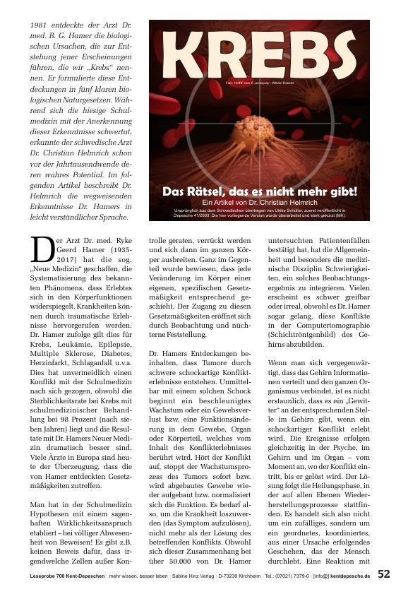»1981 entdeckte der Arzt Dr. med. R. G. Hamer die biologischen Ursachen, die zur Entstehung jener Erscheinungen führen, die wir „Krebs“ nennen. Er formulierte diese Entdeckungen in fünf klaren biologischen Naturgesetzen. Während sich die hiesige Schul-medizin mit der Anerkennung dieser Erkenntnisse schwertut, erkannte der schwedische Arzt Dr. Christian Helmrich schon vor der Jahrtausendwende deren wahres Potential. Im folgenden Artikel beschreibt Dr. Helmrich die wegweisenden Erkenntnisse Dr. Hamers in leicht verständlicher Sprache.«