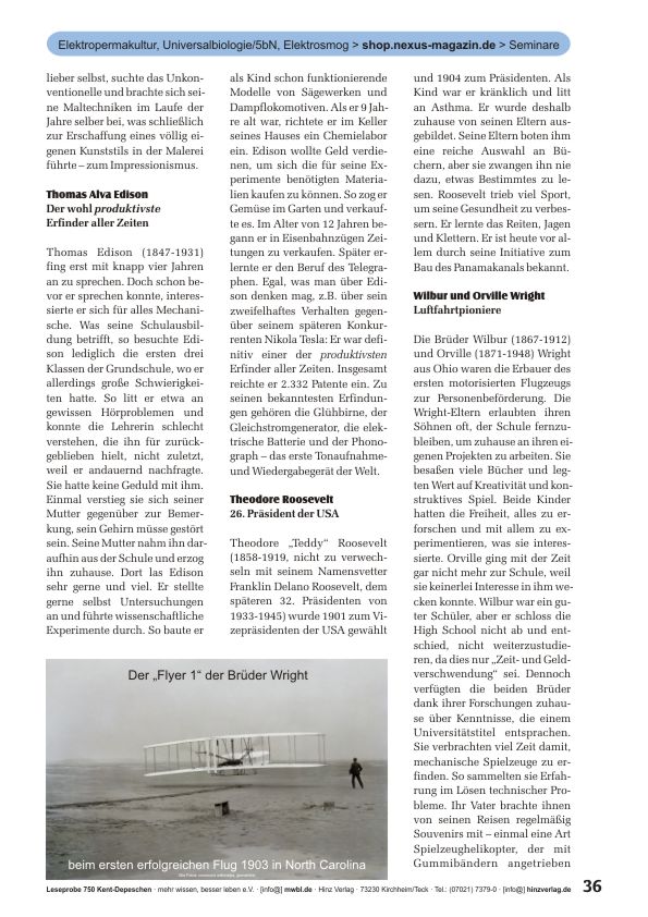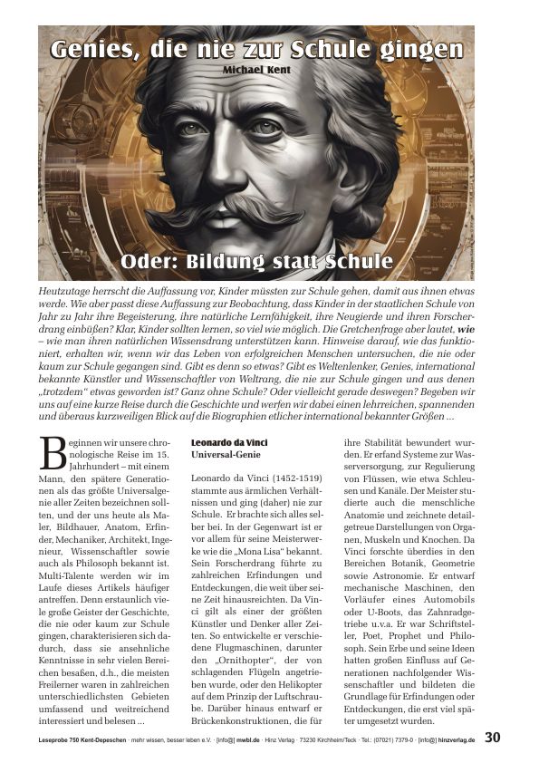»Heutzutage herrscht die Auffassung vor, Kinder müssten zur Schule gehen, damit aus ihnen etwas werde. Wie aber passt diese Auffassung zur Beobachtung, dass Kinder in der staatlichen Schule von Jahr zu Jahr ihre Begeisterung, ihre natürliche Lernfähigkeit, ihre Neugierde und ihren Forscherdrang einbüßen? Klar, Kinder sollten lernen, so viel wie möglich. Die Gretchenfrage aber lautet, wie – wie man ihren natürlichen Wissensdrang unterstützen kann. Hinweise darauf, wie das funktioniert, erhalten wir, wenn wir das Leben von erfolgreichen Menschen untersuchen, die nie oder kaum zur Schule gegangen sind. Gibt es denn so etwas? Gibt es Weltenlenker, Genies, international bekannte Künstler und Wissenschaftler von Weltrang, die nie zur Schule gingen und aus denen „trotzdem“ etwas geworden ist? Ganz ohne Schule? Oder vielleicht gerade deswegen? Begeben wir uns auf eine kurze Reise durch die Geschichte und werfen wir dabei einen spannenden und kurzweiligen Blick auf die Biographien international bekannter Größen ...«