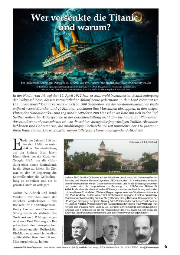 »In der Nacht vom 14. auf den 15. April 1912 kam es zum wohl bekanntesten Schiffsuntergang der Weltgeschichte, dessen vermeintlicher Ablauf heute jedermann in den Kopf gebrannt ist. Die „unsinkbare“ Titanic versank – noch ca. 300 Seemeilen von der nordamerikanischen Küste entfernt – zwei Stunden und 40 Minuten, nachdem ihre Maschinen abstoppten, in den eisigen Fluten des Nordatlantiks – und zog rund 1.500 der 2.200 Menschen an Bord mit sich in den Tod. Seither reißen die Widersprüche in der Berichterstattung nicht ab – bis heute! Ein Phänomen, das mindestens ebenso seltsam ist, wie die schiere Menge der fragwürdigen Zufälle, Absonderlichkeiten und Geheimnisse, die unabhängige Rechercheure seit nunmehr über 110 Jahren in ihren Bann ziehen. Die wichtigsten davon lüftet John Hamer im folgenden Artikel.«
