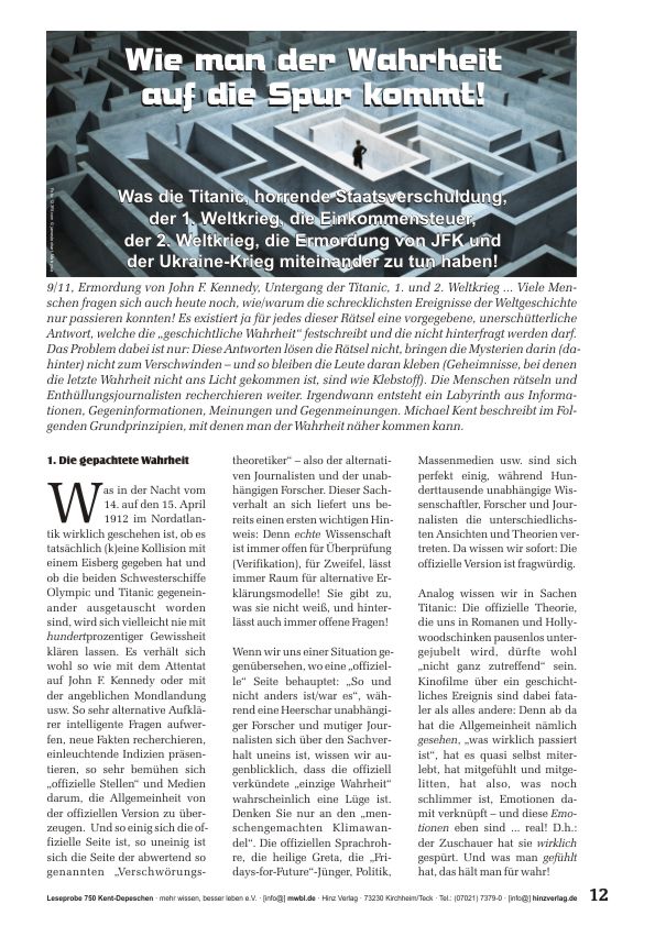 »9/11, Ermordung von John F. Kennedy, Untergang der Titanic, 1. und 2. Weltkrieg ... Viele Menschen fragen sich auch heute noch, wie/warum diese schrecklichen Ereignisse passieren konnten! Es existiert für jedes dieser Rätsel eine vorgegebene, unerschütterliche Antwort, welche die „geschichtliche Wahrheit“ festschreibt und die nicht hinterfragt werden darf. Das Problem dabei ist nur: Diese Antworten lösen die Rätsel nicht – und so bleiben die Leute daran kleben (Geheimnisse, bei denen die letzte Wahrheit nicht ans Licht gekommen ist, sind wie Klebstoff). Die Menschen rätseln und Enthüllungsjournalisten recherchieren weiter. Irgendwann entsteht ein Labyrinth aus Informationen, Gegeninformationen, Meinungen und Gegenmeinungen. M. Kent beschreibt im Folgenden Grundprinzipien, mit denen man der Wahrheit näher kommen kann.«