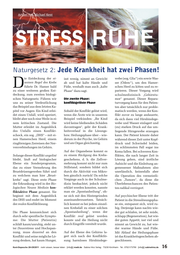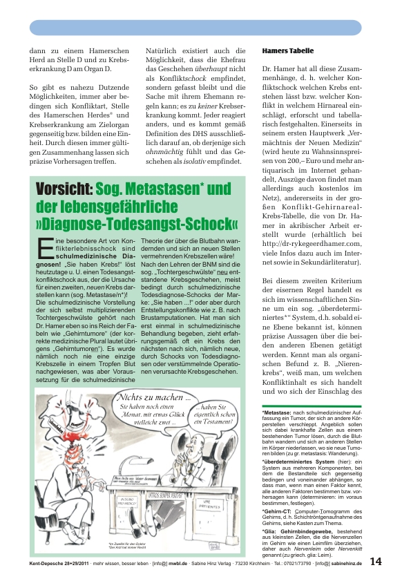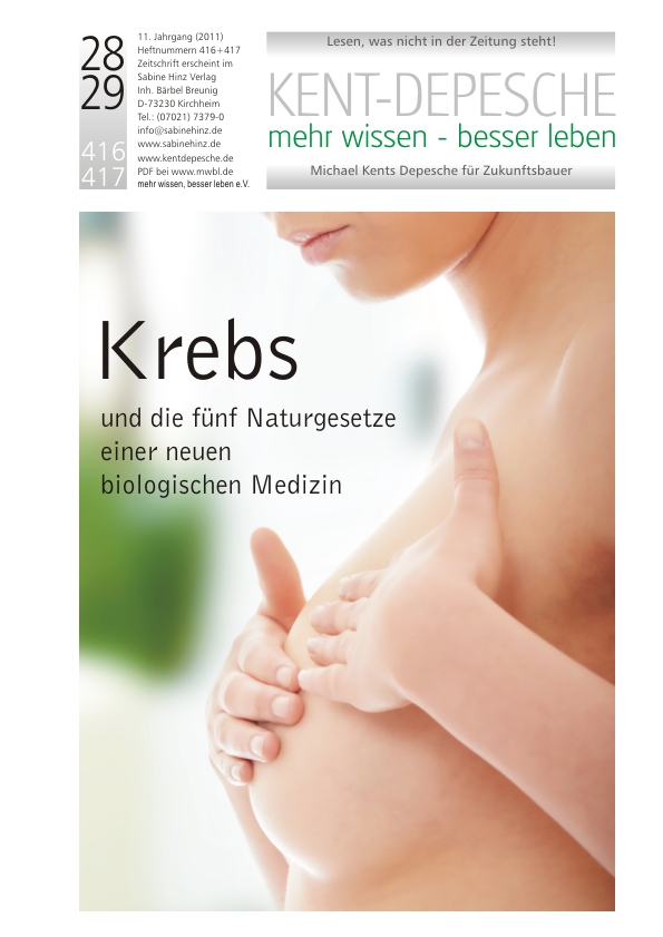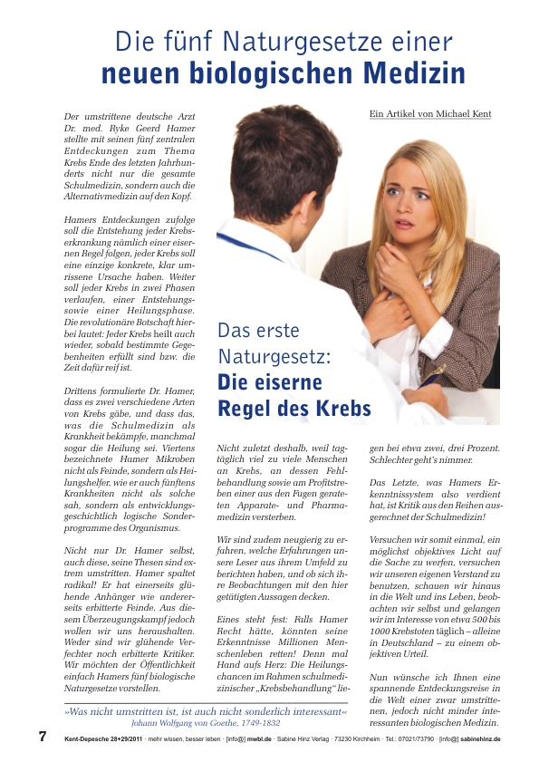 »Der umstrittene deutsche Arzt Dr. med. Ryke Geerd Hamer stellte mit seinen fünf zentralen Entdeckungen zum Thema Krebs Ende des letzten Jahrhunderts nicht nur die gesamte Schulmedizin, sondern auch die Alternativmedizin auf den Kopf. Hamers Entdeckungen zufolge soll die Entstehung jeder Krebserkrankung nämlich einer eisernen Regel folgen, jeder Krebs soll eine einzige konkrete, klar umrissene Ursache haben. Weiter soll jeder Krebs in zwei Phasen verlaufen, einer Entstehungs- sowie einer Heilungsphase. Die revolutionäre Botschaft hierbei lautet: Jeder Krebs heilt auch wieder, sobald bestimmte Gegebenheiten erfüllt sind bzw. die Zeit dafür reif ist.Drittens formulierte Dr. Hamer, dass es zwei verschiedene Arten von Krebs gäbe, und dass das, was die Schulmedizin als Krankheit bekämpfe, manchmal sogar die Heilung sei. Viertens bezeichnete Hamer Mikroben nicht als Feinde, sondern als Heilungshelfer, wie er auch fünftens Krankheiten nicht als solche sah, sondern als entwicklungsgeschichtlich logische Sonderprogramme des Organismus. Nicht nur Dr. Hamer selbst, auch diese, seine Thesen sind extrem umstritten. Hamer spaltet radikal! Er hat einerseits glühende Anhänger wie andererseits erbitterte Feinde. Aus diesem Überzeugungskampf jedoch wollen wir uns heraushalten.