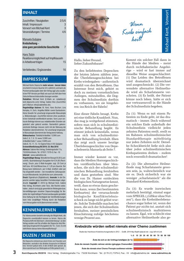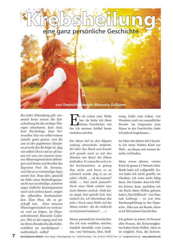 »Bei jeder Erkrankung gilt: niemand kann einem die Entscheidung für die richtige Therapie abnehmen, kein Arzt, kein Psychologe, kein Verwandter. Nur wir selbst wissen intuitiv, was für uns in der gegebenen Situation das Richtige ist. Doch viel zu oft lassen wir uns von unserer inneren Gewissheit abbringen und hören auf den Rat des Experten Prof. Dr. Sowieso, weil der ja so vernünftige Argumente hat. Dass dies, speziell im Falle einer Krebsdiagnose, nicht nur nachteilige, sondern sogar tödliche Konsequenzen nach sich ziehen kann, zeigen die offiziellen Krebsstatistiken. Eine Frau, die es geschafft hat, ihrer inneren Wissen zu vertrauen und zu folgen, ist Depeschenleserin Manuela Guljajew. Wie es ihr erging und wie sie ihren Brustkrebs überlebte, schildert sie nachfolgend – authentisch – selbst!«