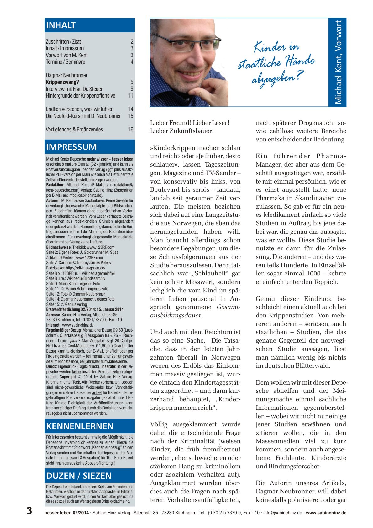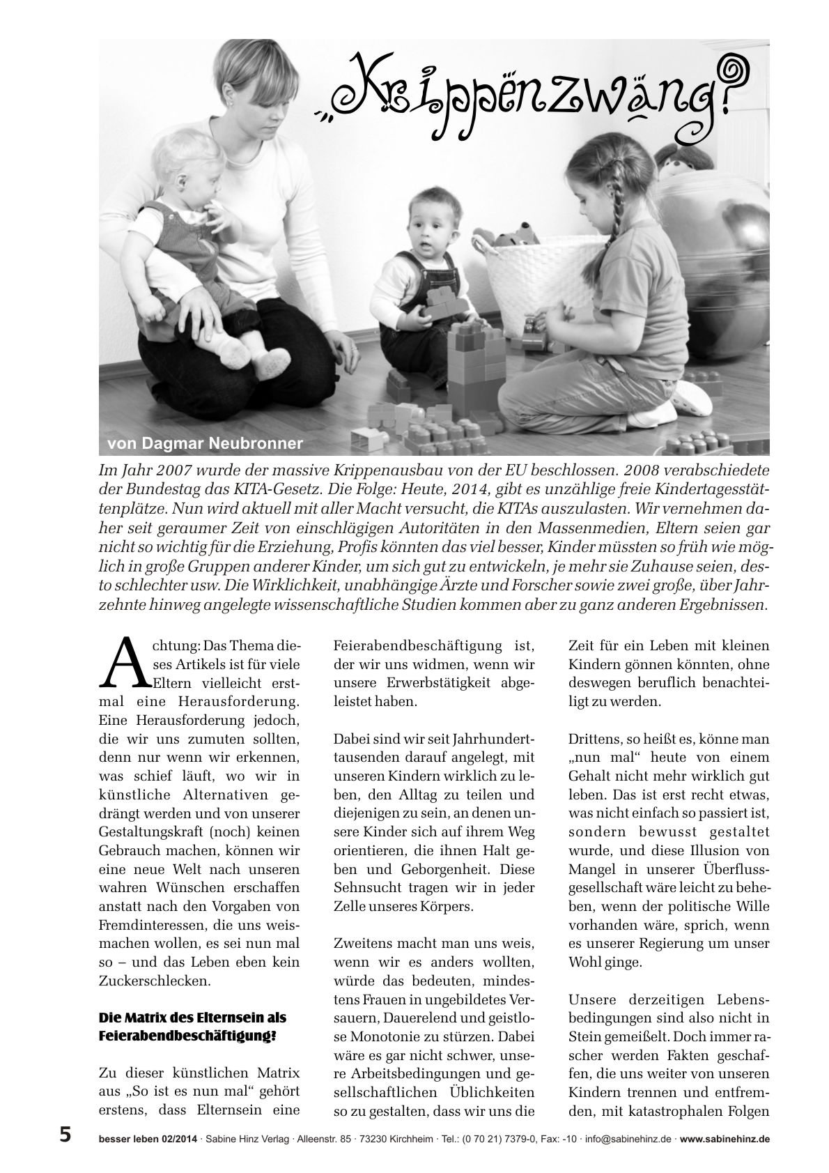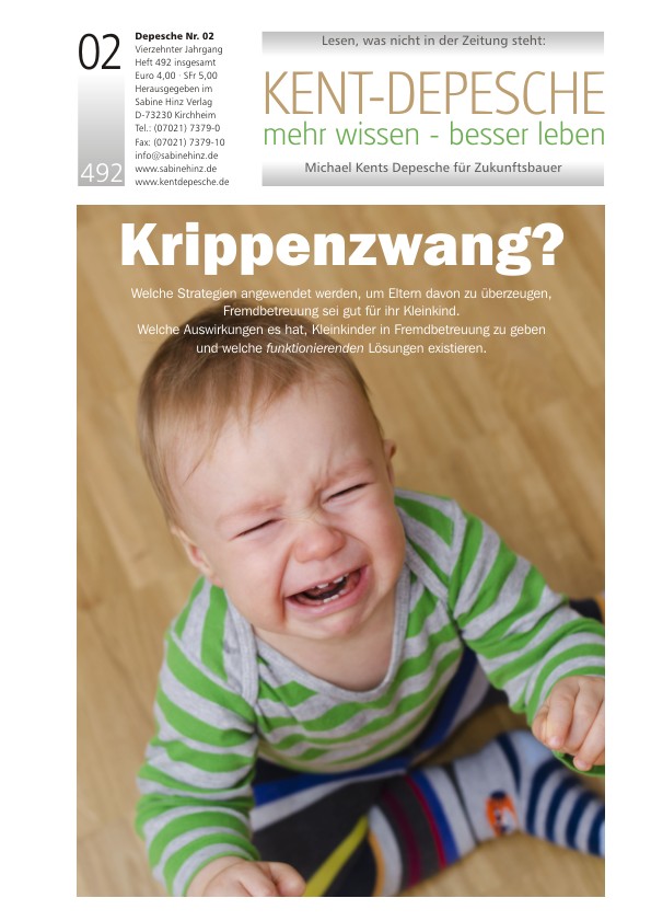 Im Jahr 2007 wurde der massive Krippenausbau von der EU beschlossen. 2008 verabschiedete der Bundestag das KITA-Gesetz. Die Folge: 2014 gibt es unzählige freie Kindertagesstättenplätze. Nun wird mit aller Macht versucht, die KITAs auszulasten. Wir vernehmen daher seit geraumer Zeit von einschlägigen Autoritäten in den Massenmedien, Eltern seien gar nicht so wichtig für die Erziehung, Profis könnten das viel besser, Kinder müssten so früh wie möglich in große Gruppen anderer Kinder, um sich gut zu entwickeln, je mehr sie Zuhause seien, desto schlechter usw. Die Wirklichkeit, unabhängige Ärzte und Forscher sowie zwei große, über Jahrzehnte hinweg angelegte wissenschaftliche Studien kommen aber zu ganz anderen Ergebnissen.
