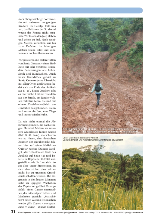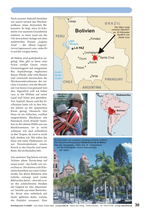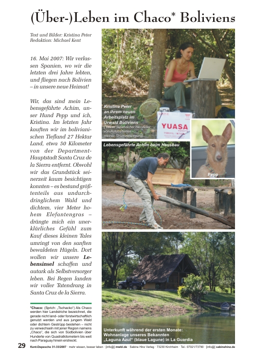 »16. Mai 2007: Wir verlassen Spanien, wo wir die letzten drei Jahre lebten, und fliegen nach Bolivien – in unsere neue Heimat!Wir, das sind mein Lebensgefährte Achim, unser Hund Pepp und ich, Kristina. Im letzten Jahr kauften wir im bolivianischen Tiefland 27 Hektar Land, etwa 50 Kilometer von der Department-Hauptstadt Santa Cruz de la Sierra entfernt. Obwohl wir das Grundstück seinerzeit kaum besichtigen konnten – es bestand größtenteils aus undurchdringlichem Wald und dichtem, vier Meter hohem Elefantengras – drängte mich ein unerklärliches Gefühl zum Kauf dieses kleinen Tales umringt von den sanften bewaldeten Hügeln. Dort wollen wir unsere Lebensinsel schaffen und autark als Selbstversorger leben. Bei Regen landen wir voller Tatendrang in Santa Cruz de la Sierra.«