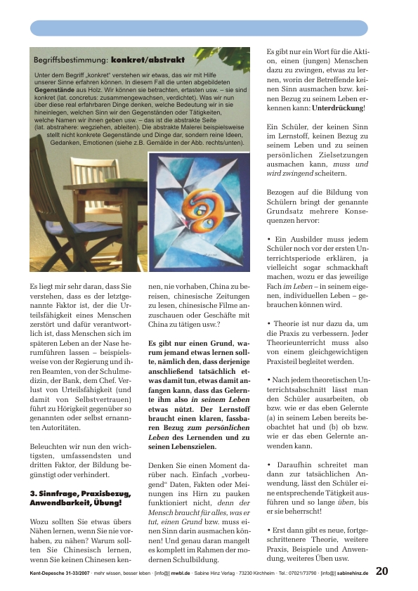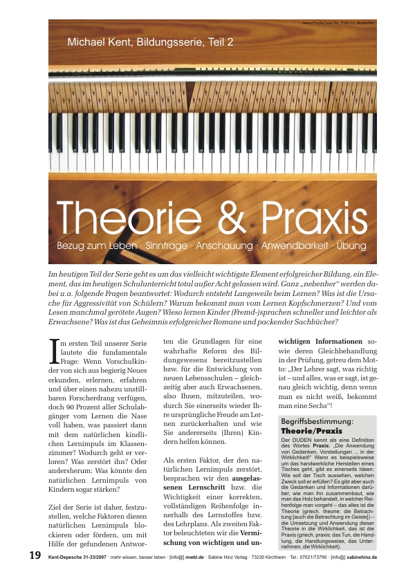 »Im heutigen Teil der Serie geht es um das vielleicht wichtigste Element erfolgreicher Bildung, ein Element, das im heutigen Schulunterricht total außer Acht gelassen wird. Ganz „nebenher“ werden dabei u.a. folgende Fragen beantwortet: Wodurch entsteht Langeweile beim Lernen? Was ist die Ursache für Aggressivität von Schülern? Warum bekommt man vom Lernen Kopfschmerzen? Und vom Lesen manchmal gerötete Augen? Wieso lernen Kinder (Fremd-)sprachen schneller und leichter als Erwachsene? Was ist das Geheimnis erfolgreicher Romane und packender Sachbücher?«