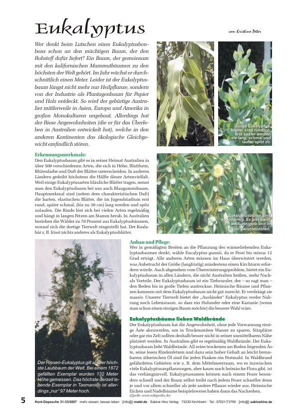 »Wer denkt beim Lutschen eines Eukalyptusbonbons schon an den mächtigen Baum, der den Rohstoff dafür liefert? Ein Baum, der gemeinsam mit den kalifornischen Mammutbäumen zu den höchsten der Welt gehört. Im Jahr wächst er durchschnittlich einen Meter. Leider ist der Eukalyptusbaum längst nicht mehr nur Heilpflanze, sondern von der Industrie als Plantagenbaum für Papier und Holz entdeckt. So wird der gebürtige Australier mittlerweile in Asien, Europa und Amerika in großen Monokulturen angebaut. Allerdings hat der Riese Angewohnheiten (die er für das Überleben in Australien entwickelt hat), welche in den anderen Kontinenten das ökologische Gleichgewicht emfindlich stören.«